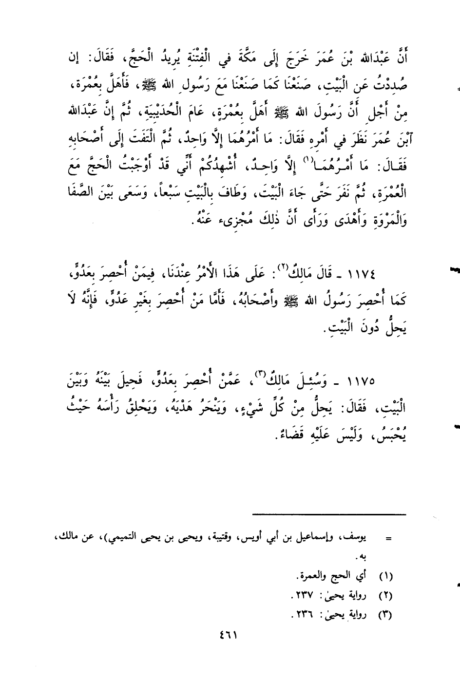 ١١٧٤ - قَالَ مَالِك: على هَذَا الأَمْرُ عِنْدَنَا، فِيمَنْ أُحْصِرَ بِعَدُوٍّ، كَمَا أُحْصِرَ رسول الله صَلى الله عَلَيه وَسَلم وَأَصْحَابُهُ، فَأَمَّا مَنْ أُحْصِرَ بِغَيْرِ عَدُوٍّ: فَإِنَّهُ لا يَحِلُّ دُونَ الْبَيْتِ ...