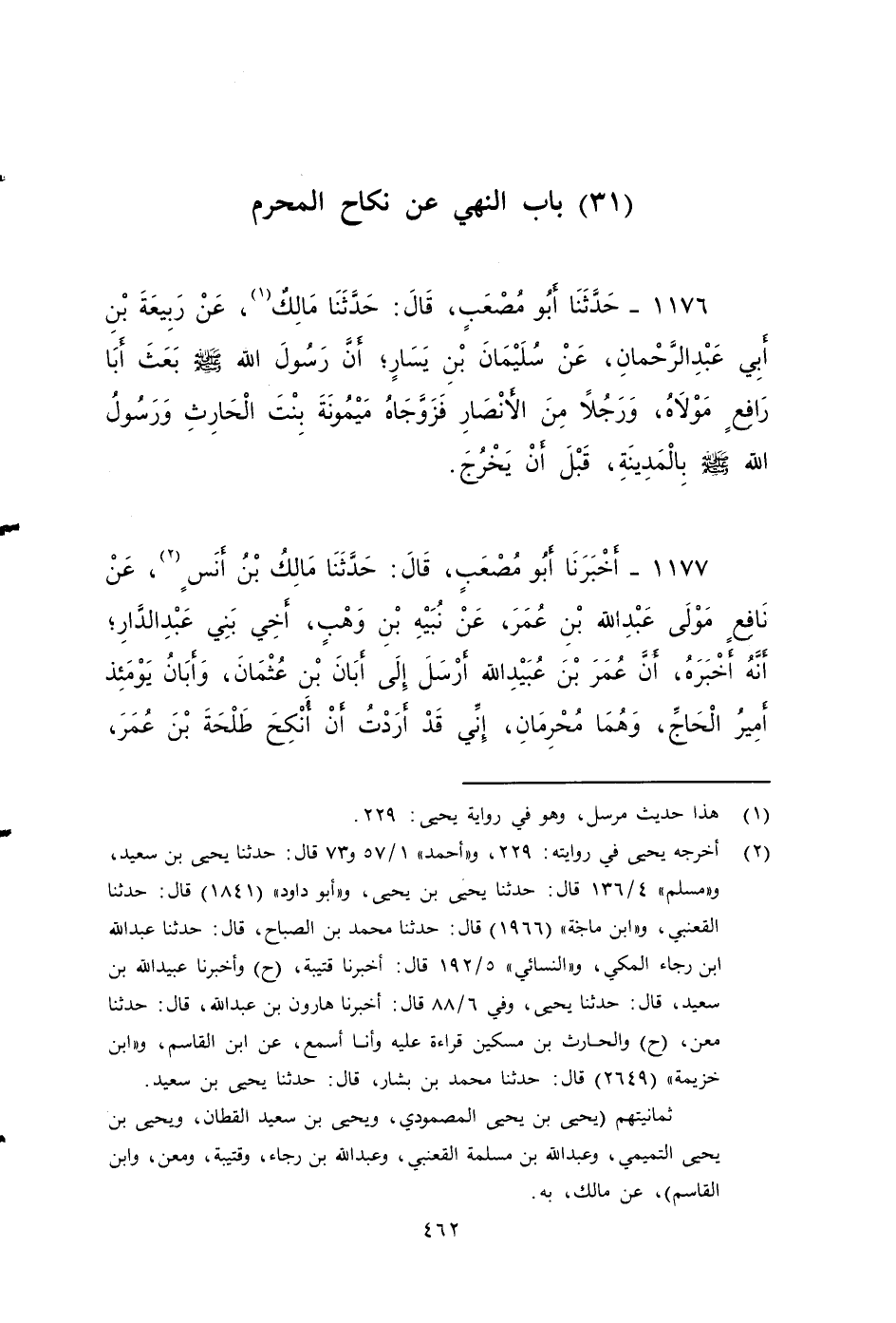 ١١٧٧ - أخبرنا أَبُو مُصْعَبٍ، قَالَ: حَدَّثَنَا مَالِكٌ بن أنس، عَنْ نَافِعٍ مولى عبد الله بن عمر، عَنْ نُبَيْهِ بْنِ وَهْبٍ، أَخِي بَنِي عَبْدِ الدَّارِ، أنه أخبره، أَنَّ عُمَرَ بْنَ عُبَيْدِ اللَّهِ: أَرْسَلَ إِلَى أَبَانَ بْنِ عُثْمَانَ، وَأَبَانُ يَوْمَئِذٍ أَمِيرُ الْحَاجِّ وَهُمَا مُحْرِمَانِ: إِنِّي قَدْ أَرَدْتُ أَنْ أُنْكِحَ طَلْحَةَ بْنَ عُمَرَ بِنْتَ شَيْبَةَ بْنِ جُبَيْرٍ، فَأَرَدْتُ أَنْ تَحْضُرَذلك، فَأَنْكَرَ ذَلِكَ عَلَيْهِ أَبَانُ، وَقَالَ: سَمِعْتُ عُثْمَانَ بْنَ عَفَّانَ رَحْمَةُ اللَّهِ عَلَيْهِ، يَقُولُ: قَالَ رَسُولُ اللَّهِ صَلى الله عَلَيه وَسَلم: لا يَنْكِحِ الْمُحْرِمُ، وَلَا يَخْطُبُ ولاينكح ...