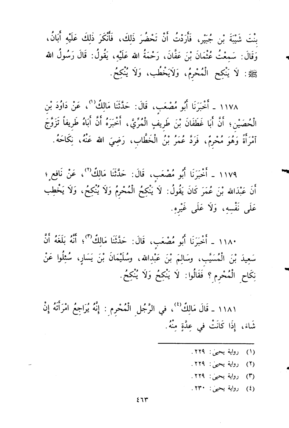 ١١٧٨ - أخبرنا أَبُو مُصْعَبٍ، قَالَ: حَدَّثَنَا مَالِكٌ، عَنْ دَاوُدَ بْنِ الْحُصَيْنِ، أَنَّ أَبَا غَطَفَانَ بْنَ طَرِيفٍ الْمُرِّيَّ أَخْبَرَهُ , أَنَّ أَبَاهُ طَرِيفًا تَزَوَّجَ امْرَأَةً وَهُوَ مُحْرِمٌ , فَرَدَّ عُمَرُ بْنُ الْخَطَّابِ - رضي الله عنه - نِكَاحَهُ ...