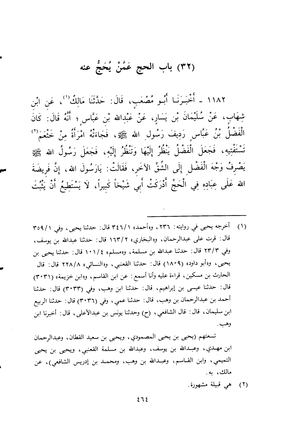 ١١٨٢ - أخبرنا أَبُو مُصْعَبٍ، قَالَ: حَدَّثَنَا مَالِكٌ، عَنِ ابْنِ شِهَابٍ، عَنْ سُلَيْمَانَ بْنِ يَسَارٍ، عَنْ عَبْدِ اللَّهِ بْنِ عَبَّاسٍ، أنه قَالَ: كَانَ الْفَضْلُ بْنُ عَبَّاسٍ رَدِيفَ رَسُولِ اللَّهِ صَلى الله عَلَيه وَسَلم فَجَاءَتْهُ امْرَأَةٌ مِنْ خَثْعَمَ تَسْتَفْتِيهِ، فَجَعَلَ الْفَضْلُ يَنْظُرُ إِلَيْهَا، وَتَنْظُرُ إِلَيْهِ، فَجَعَلَ رَسُولُ اللَّهِ صَلى الله عَلَيه وَسَلم يَصْرِفُ وَجْهَ الْفَضْلِ إِلَى الشِّقِّ الْآخَرِ، فَقَالَتْ: يَا رَسُولَ اللَّهِ، إِنَّ فَرِيضَةَ اللَّهِ على عباده فِي الْحَجِّ أَدْرَكَتْ أَبِي شَيْخًا كَبِيرًا، لا يَسْتَطِيعُ أَنْ يَثْبُتَ عَلَى الرَّاحِلَةِ، أَفَأَحُجُّ عَنْهُ؟ قَالَ: نَعَمْ، حُجِّي عَنْهُ، أَرَأَيْتِ لَوْ كَانَ عَلَى أَبِيكِ دَيْنٌ، فَقَدْ قَضَيْتِ، وَذَلِكَ فِي حَجَّةِ الْوَدَاعِ ...