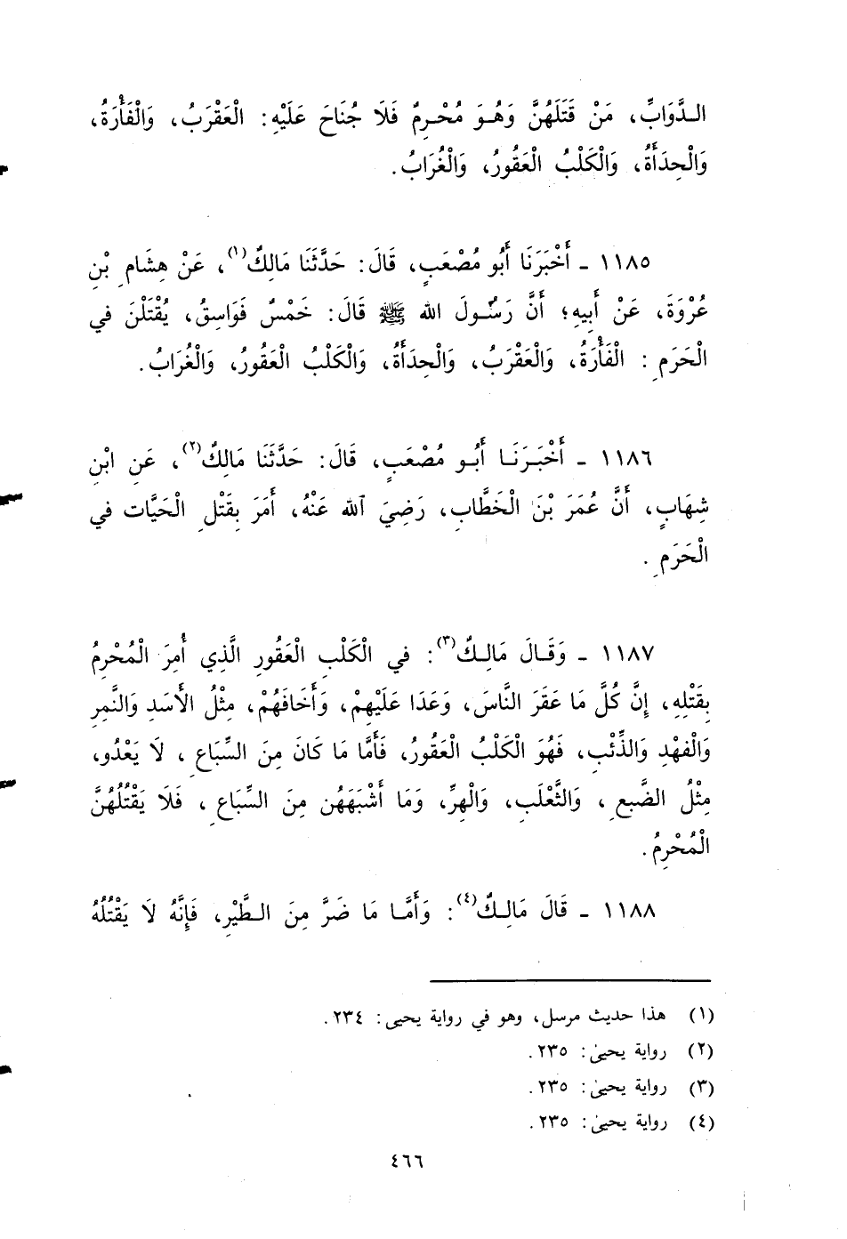 ١١٨٥ - أخبرنا أَبُو مُصْعَبٍ، قَالَ: حَدَّثَنَا مَالِكٌ، عَنْ هِشَامِ بْنِ عُرْوَةَ، عَنْ أَبِيهِ، أن رسول اللَّهِ صَلى الله عَلَيه وَسَلم، قَالَ: خَمْسٌ فَوَاسِقُ، يُقْتَلْنَ فِي الْحَرَمِ: الْفَأْرَةُ، وَالْعَقْرَبُ، وَالْحِدَأَةُ، وَالْكَلْبُ الْعَقُورُوَالْغُرَابُ.