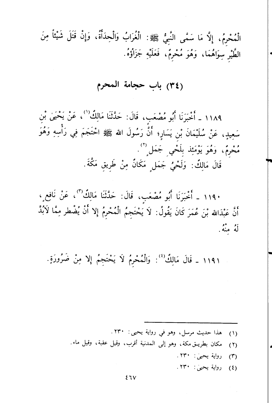 ١١٩٠ - أخبرنا أَبُو مُصْعَبٍ، قَالَ: حَدَّثَنَا مَالِكٌ، عَنْ نَافِعٍ، أَنَّ عَبْدِ اللهِ بْنِ عُمَرَ، كَانَ يَقُولُ: لَا يَحْتَجِمُ الْمُحْرِمُ إِلَاّ أَنْ يَضْطَرَّ, مِمَّا لَا بُدَّ لَهُ مِنْهُ.....