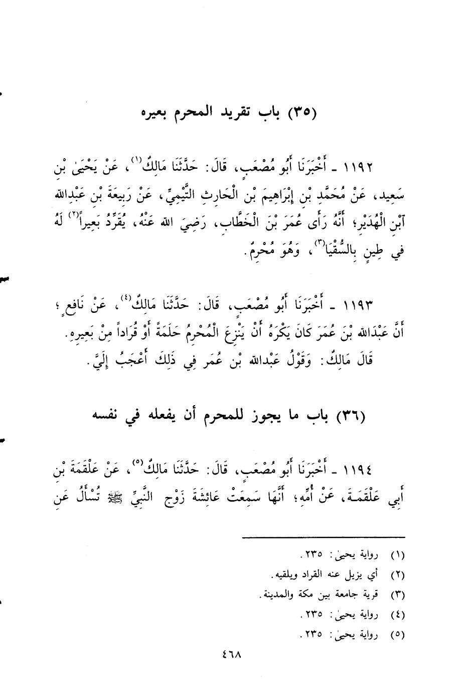 ١١٩٢ - أخبرنا أَبُو مُصْعَبٍ، قَالَ: حَدَّثَنَا مَالِكٌ، عَنْ يَحْيَى بْنِ سَعِيدٍ، عَنْ مُحَمَّدِ بْنِ إِبْرَاهِيمَ بْنِ الْحَارِثِ التَّيْمِيِّ، عَنْ رَبِيعَةَ بْنِ أَبِي عَبْدِ اللهِ بْنِ الْهُدَيْرِ، أَنَّهُ رَأَى عُمَرَ بْنَ الْخَطَّابِ صَلى الله عَلَيه وَسَلم يُقَرِّدُ بَعِيرًا لَهُ فِي طِينٍ بِالسُّقْيَا وَهُوَ مُحْرِمٌ ...