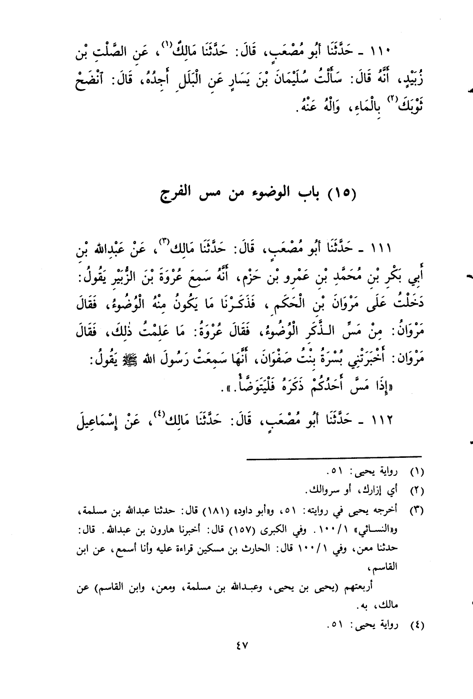 ١١١ - حَدَّثَنَا أَبُو مُصْعَبٍ، قَالَ: حَدَّثَنَا مَالِكٌ، عَنْ عَبْدِ اللَّهِ بْنِ أَبِي بَكْرِ بْنِ مُحَمَّدِ بْنِ عَمْرِو بْنِ حَزْمٍ، أَنَّهُ سَمِعَ عُرْوَةَ بْنَ الزُّبَيْرِ، يَقُولُ: دَخَلْتُ عَلَى مَرْوَانَ بْنِ الْحَكَمِ فَذَاكَرْنَا مَا يَكُونُ مِنْهُ الْوُضُوءُ، فَقَالَ مَرْوَانُ: مِنْ مَسِّ الذَّكَرِ الْوُضُوءُ، فَقَالَ عُرْوَةُ: مَا عَلِمْتُ ذلك، فَقَالَ مَرْوَانُ: أَخْبَرَتْنِي بُسْرَةُ بِنْتُ صَفْوَانَ أَنَّهَا سَمِعَتْ رَسُولَ اللَّهِ صَلى الله عَلَيه وَسَلم، يَقُولُ: إِذَا مَسَّ أَحَدُكُمْ ذَكَرَهُ فَلْيَتَوَضَّأْ.