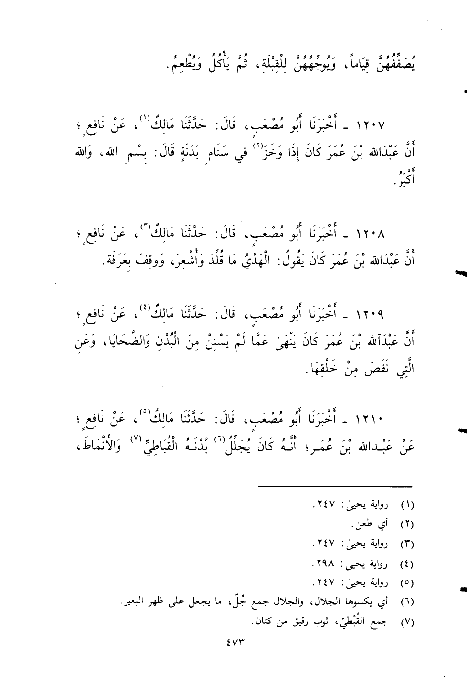 ١٢١٠ - أخبرنا أَبُو مُصْعَبٍ، قَالَ: حَدَّثَنَا مَالِكٌ، عَنْ نَافِعٍ، عن عَبْدَ اللهِ بْنَ عُمَرَ أَنَّه كَانَ يُجَلِّلُ بُدْنَهُ الْقُبَاطِيَّ، وَالأََنْمَاطَ , وَالْحُلَلَ، ثُمَّ يَبْعَثُ بِهَا إِلَى الْكَعْبَةِ , فَيَكْسُوهَا إِيَّاهَا.