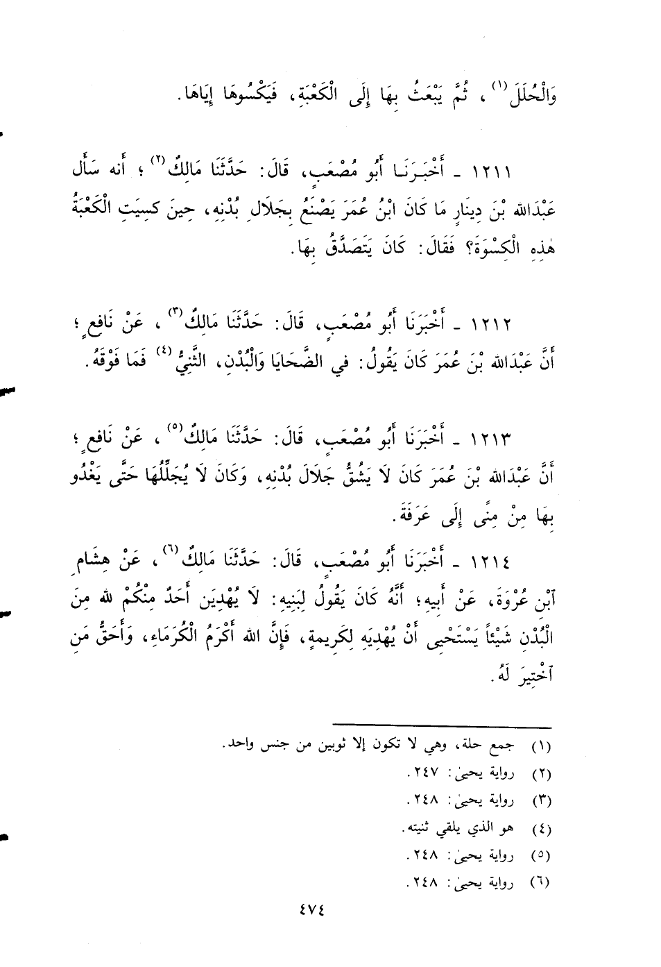 ١٢١٣ - أخبرنا أَبُو مُصْعَبٍ، قَالَ: حَدَّثَنَا مَالِكٌ، عَنْ نَافِعٍ، أَنَّ عَبْدَ اللهِ بْنَ عُمَرَ كَانَ لَا يَشُقُّ جِلَالَ بُدْنِهِ وَكان لَا يُجَلِّلُهَا , حَتَّى يَغْدُوَ بها مِنْ مِنًى إِلَى عَرَفَةَ.