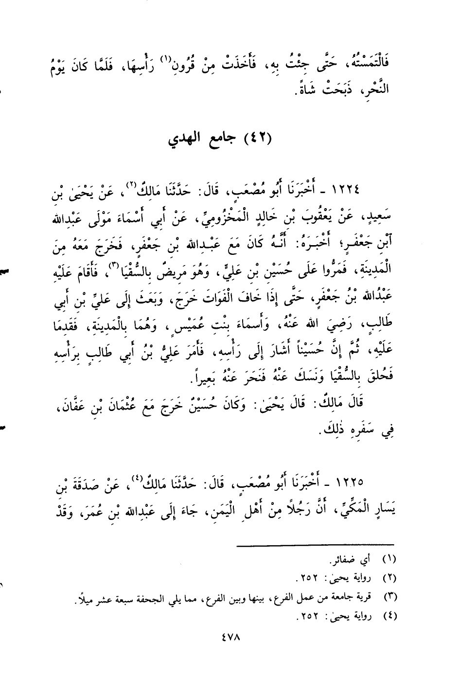 ١٢٢٤ - أخبرنا أَبُو مُصْعَبٍ، قَالَ: حَدَّثَنَا مَالِكٌ، عَنْ يَحْيَى بْنِ سَعِيدٍ، عَنْ يَعْقُوبَ بْنِ خَالِدٍ الْمَخْزُومِيِّ، عَنْ أَبِي أَسْمَاءَ , مَوْلَى عَبْدِ اللهِ بْنِ جَعْفَرٍ , أَنَّهُ أَخْبَرَهُ , أَنَّهُ كَانَ مَعَ عَبْدِ اللهِ بْنِ جَعْفَرٍ، فَخَرَجَ مَعَهُ مِنَ الْمَدِينَةِ، فَمَرُّوا عَلَى حُسَيْنِ بْنِ عَلِيٍّ , وَهُوَ مَرِيضٌ بِالسُّقْيَا، فَأَقَامَ عَلَيْهِ عَبْدُ اللهِ بْنُ جَعْفَرٍ، حَتَّى إِذَا خَافَ الْفَوَاتَ خَرَجَ، وَبَعَثَ إِلَى عَلِيِّ بْنِ أَبِي طَالِبٍ - رضي الله عنه -، وَأَسْمَاءَ بِنْتِ عُمَيْسٍ وَهُمَا بِالْمَدِينَةِ، فَقَدِمَا عَلَيْهِ، ثُمَّ إِنَّ حُسَيْنًا أَشَارَ إِلَى رَأْسِهِ، فَأَمَرَ عَلِيٌّ بِرَأْسِهِ , فَحُلِّقَ بِالسُّقْيَا، ونَسَكَ عَنْهُ، فَنَحَرَ عَنْهُ بَعِيرًا.