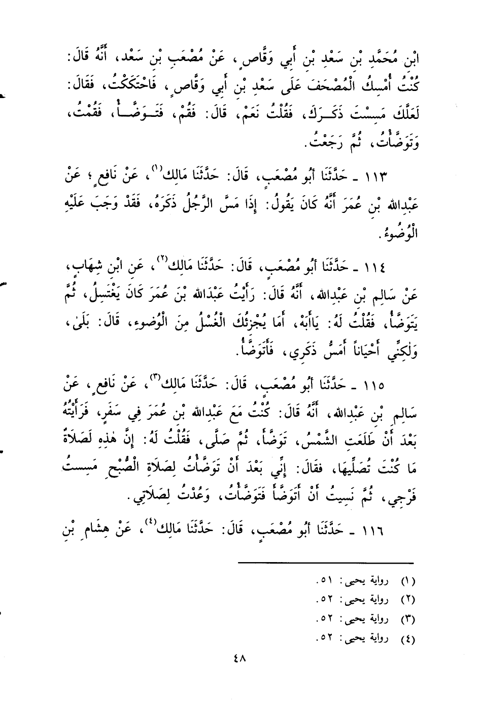 ١١٣ - حَدَّثَنَا أَبُو مُصْعَبٍ، قَالَ: حَدَّثَنَا مَالِكٌ، عَنْ نَافِعٍ , أَنَّ عَبْدَ اللهِ بْنَ عُمَرَ كَانَ يَقُولُ: إِذَا مَسَّ الرجل ذَكَرَهُ، فَقَدْ وَجَبَ عَلَيْهِ الْوُضُوءُ.
