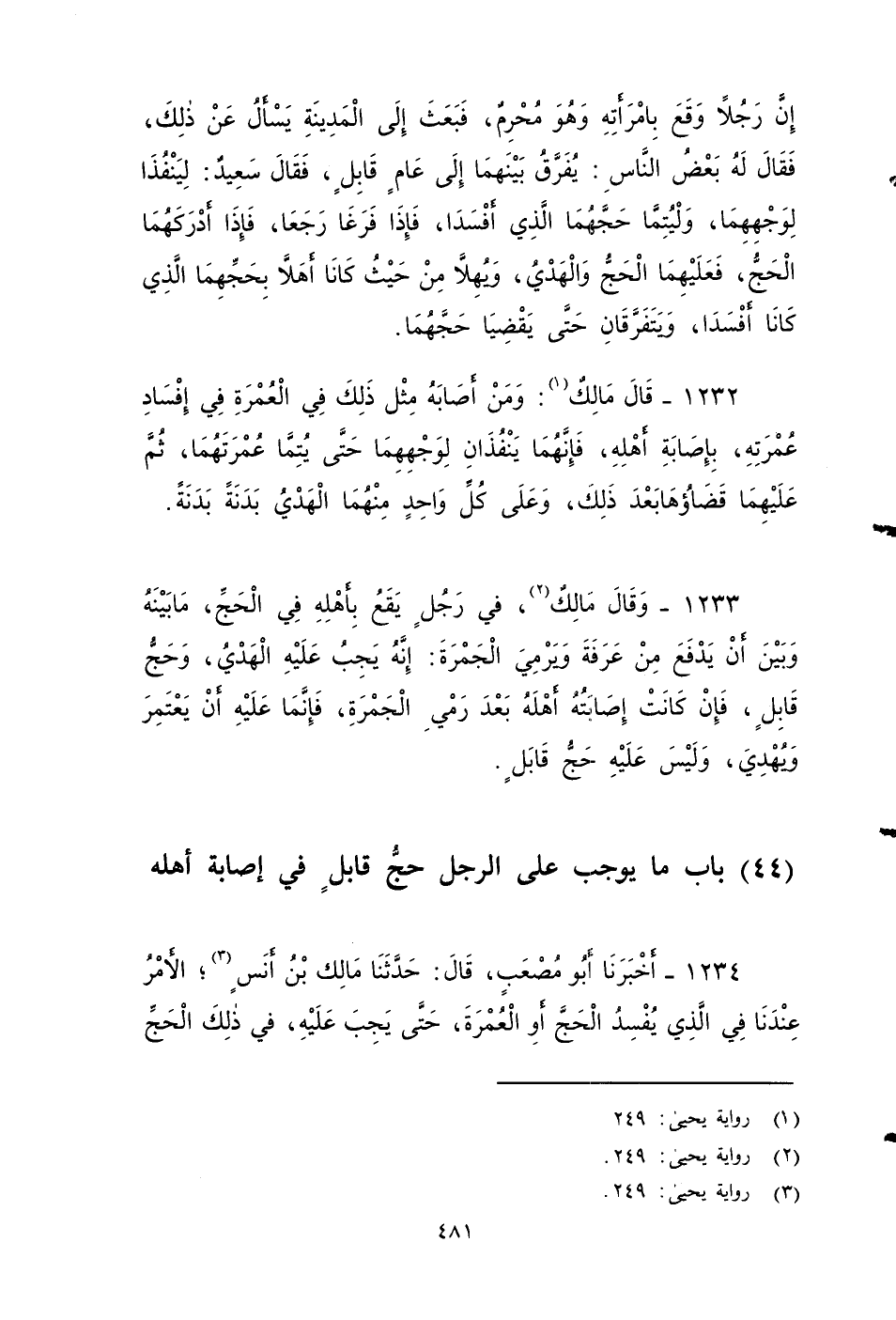 ١٢٣٤ - أخبرناأبو مصعب قَالَ: حدثنا مَالِكٌ بن أنس الأمر عندنا في الَّذِي يُفْسِدُ الْحَجَّ أَوِ الْعُمْرَةَ، حَتَّى يَجِبَ عَلَيْهِ فِي ذَلِكَ الْحَجِّ أَوِ الْعُمْرَةِ، من إصابة الرجل أهله إذا الْتِقَى الْخِتَانَانِ، وَإِنْ لَمْ يَكُنْ مَاءٌ دَافِقٌ.