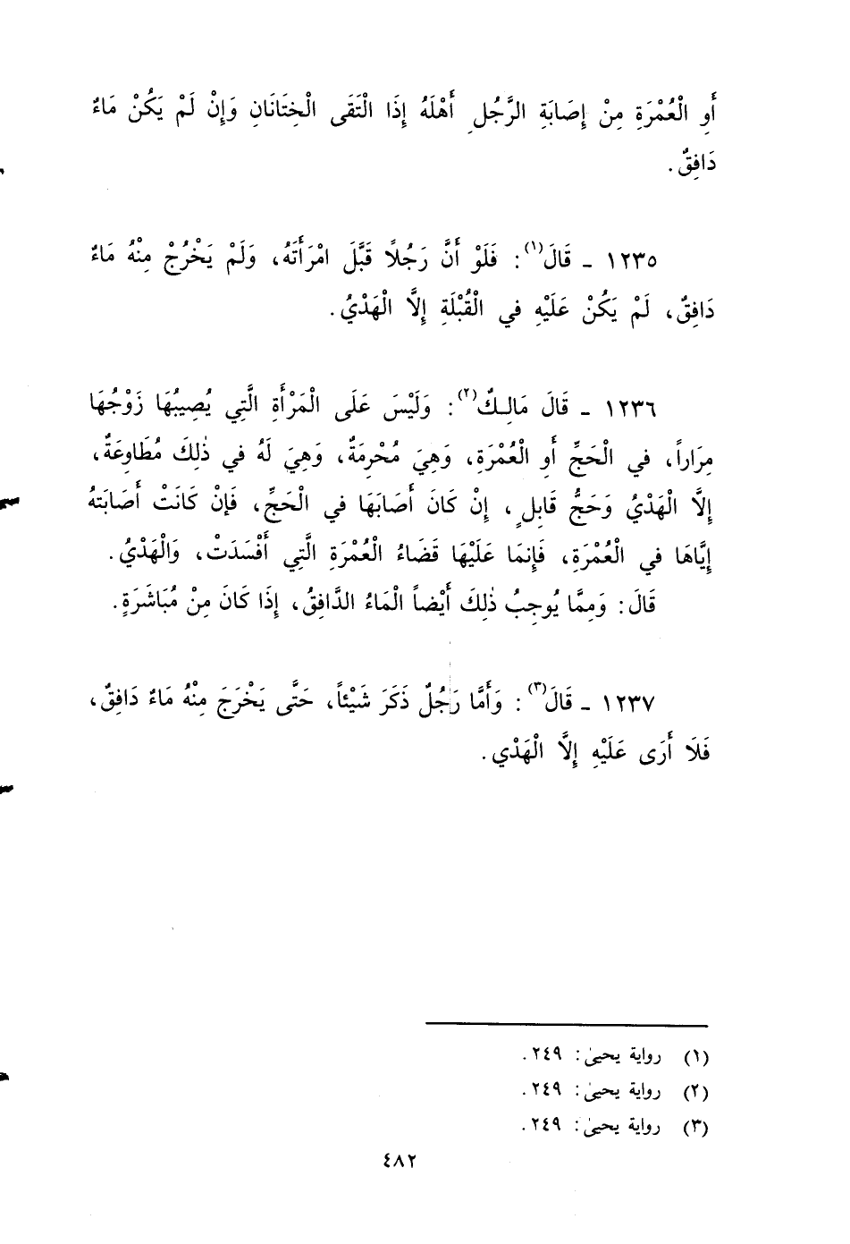 ١٢٣٧ - وأَمَّا رَجُلٌ ذَكَرَ شَيْئًا، حَتَّى يخَرَجَ مِنْهُ مَاءٌ دَافِقٌ، فَلَا أَرَى عَلَيْهِ إلا الهدي.