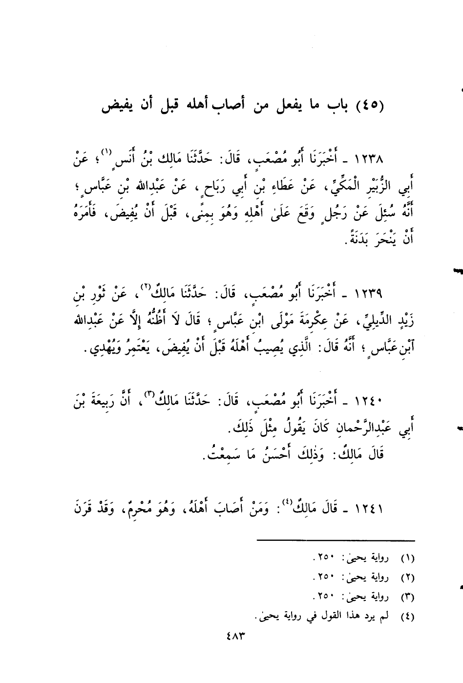 ١٢٣٨ - أخبرنا أَبُو مُصْعَبٍ، قَالَ: حَدَّثَنَا مَالِكٌ بن أنس، عَنْ أَبِي الزُّبَيْرِ الْمَكِّيِّ، عَنْ عَطَاءِ بْنِ أَبِي رَبَاحٍ، عَنْ عَبْدِ اللهِ بْنِ عَبَّاسٍ , أَنَّهُ سُئِلَ عَنْ رَجُلٍ وَقَعَ على أَهْلِهِ وَهُوَ بِمِنًى قَبْلَ أَنْ يُفِيضَ؟ فَأَمَرَهُ أَنْ يَنْحَرَ بَدَنَةً.