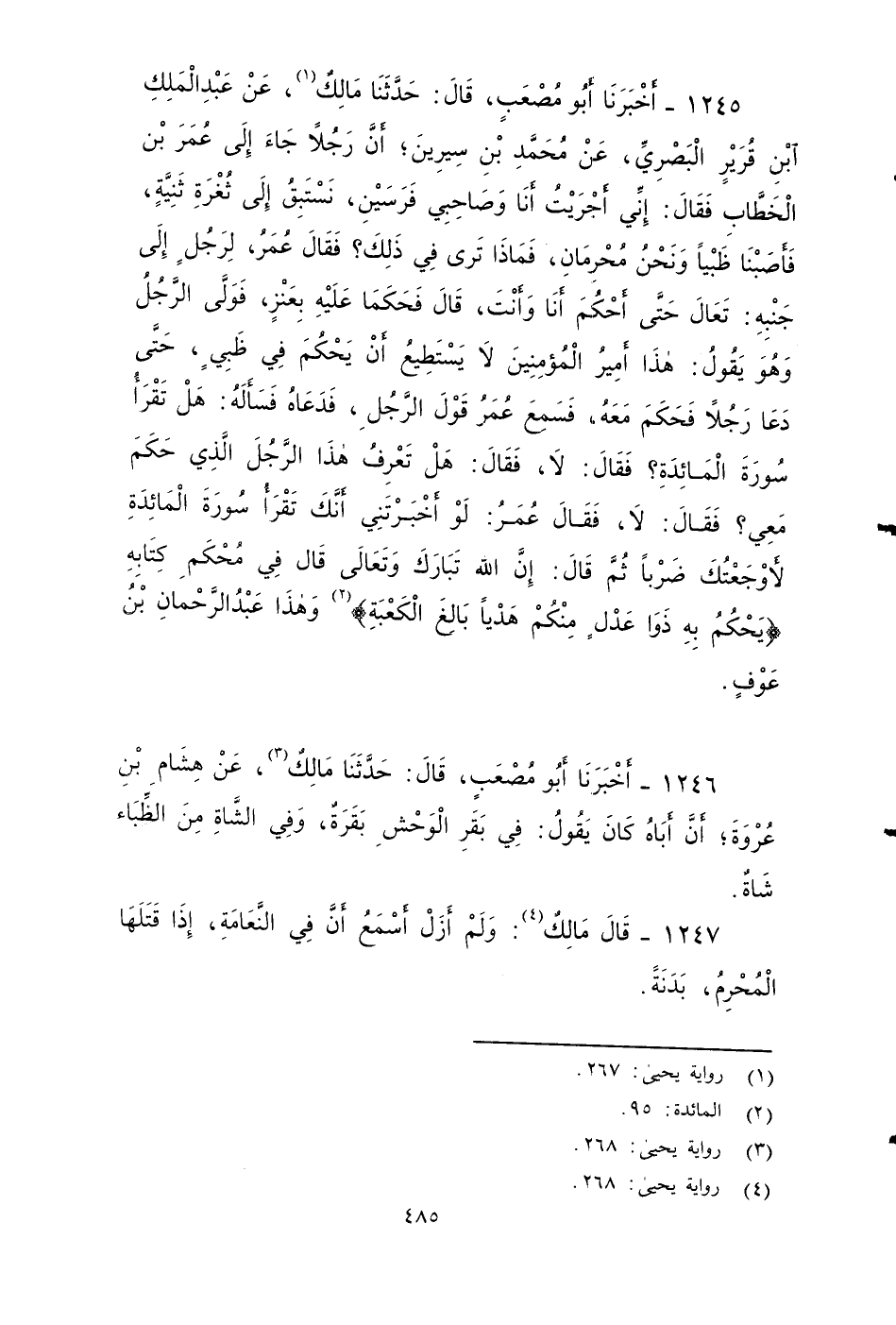 ١٢٤٥ - أخبرنا أَبُو مُصْعَبٍ، قَالَ: حَدَّثَنَا مَالِكٌ، عَنْ عَبْدِ الْمَلِكِ بْنِ قُرَيْرٍ البصري، عَنْ مُحَمَّدِ بْنِ سِيرِينَ، أَنَّ رَجُلاً جَاءَ إِلَى عُمَرَ بْنِ الْخَطَّابِ، فَقَالَ: إِنِّي أَجْرَيْتُ أَنَا وَصَاحِبٌى فَرَسَيْنِ، نَسْتَبِقُ إِلَى ثُغْرَةِ ثَنِيَّةٍ، فَأَصَبْنَا ظَبْيًا وَنَحْنُ مُحْرِمَانِ، فَمَاذَا تَرَى في ذلك؟ فَقَالَ عُمَرُ لِرَجُلٍ إِلَى جَنْبِهِ: تَعَالَ حَتَّى أَحْكُمَ أَنَا وَأَنْتَ، قَالَ: فَحَكَمَا عَلَيْهِ بِعَنْزٍ، فَوَلَّى الرَّجُلُ وَهُوَ يَقُولُ: هَذَا أَمِيرُ الْمُؤْمِنِينَ لَا يَسْتَطِيعُ أَنْ يَحْكُمَ فِي ظَبْيٍ، حَتَّى دَعَا رَجُلاً فحْكُمُ مَعَهُ، فَسَمِعَ عُمَرُ قَوْلَ الرَّجُلِ، فَدَعَاهُ , فَسَأَلَهُ: هَلْ تَقْرَأُ سُورَةَ الْمَائِدَةِ؟ فَقَالَ: لَا، فَقَالَ: فَهَلْ تَعْرِفُ هَذَا الرَّجُلَ الَّذِي حَكَمَ مَعِي؟ فَقَالَ: لَا، فَقَالَ عُمَرُ: لَوْ أَخْبَرْتَنِي أَنَّكَ تَقْرَأُ سُورَةَ الْمَائِدَةِ لأَوْجَعْتُكَ ضَرْبًا، ثُمَّ قَالَ: إِنَّ اللَّهَ تَبَارَكَ وَتَعَالَى قالُ فِي محكم كِتَابِهِ: {يَحْكُمُ بِهِ ذَوَا عَدْلٍ مِنْكُمْ هَدْيًا بَالِغَ الْكَعْبَةِ} وَهَذَا عَبْدُ الرَّحْمَنِ بْنُ عَوْفٍ.