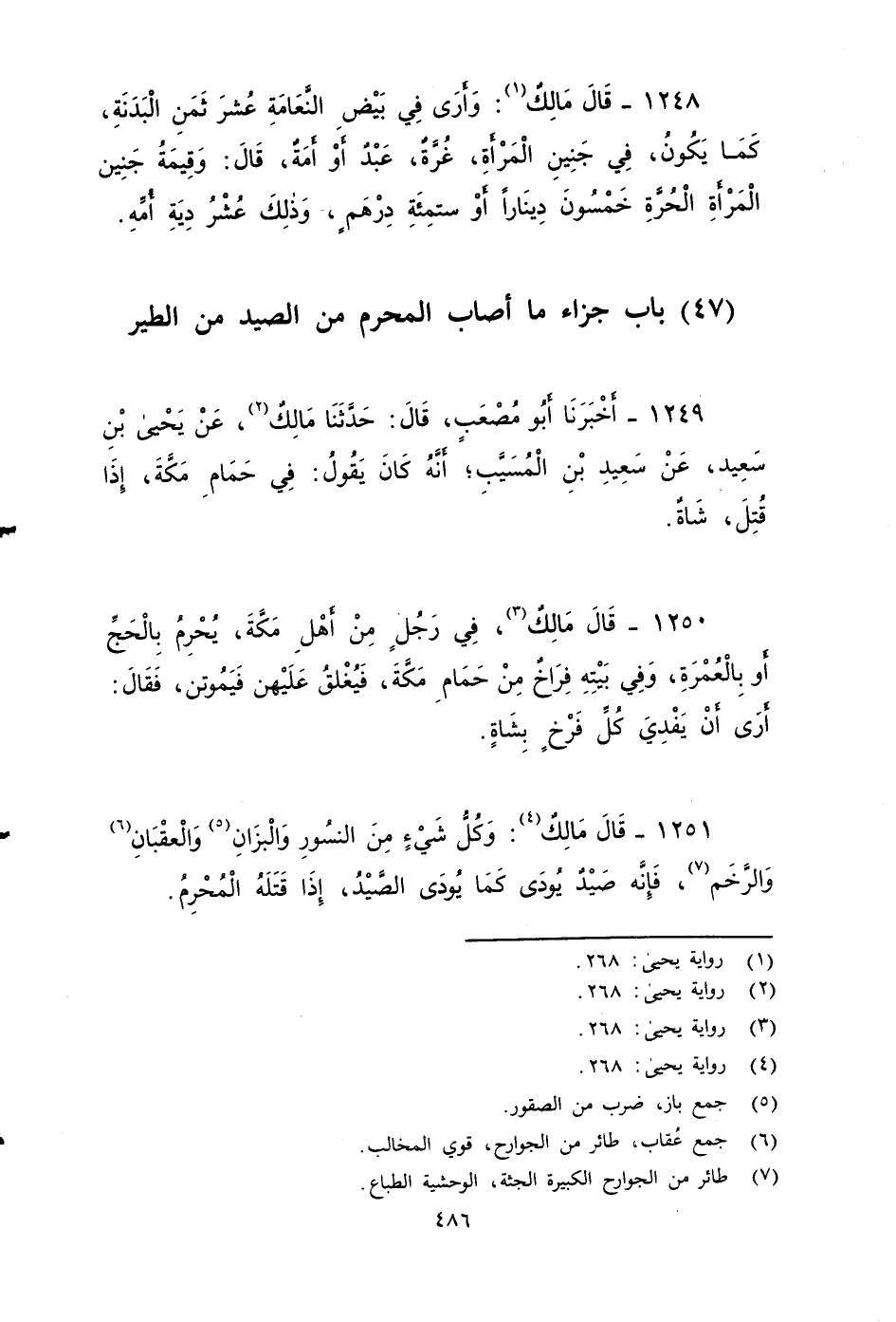 ١٢٥١ - قَالَ مَالِكٌ: وَكُلُّ شَيْءٍ مِنَ النُّسُورِ وِ الْبُزَان وِ الْعِقْبَانِ وِ الرَّخَمِ، فَإِنَّهُ صَيْدٌ يُودَى كَمَا يُودَى الصَّيْدُ، إِذَا قَتَلَهُ الْمُحْرِمُ.