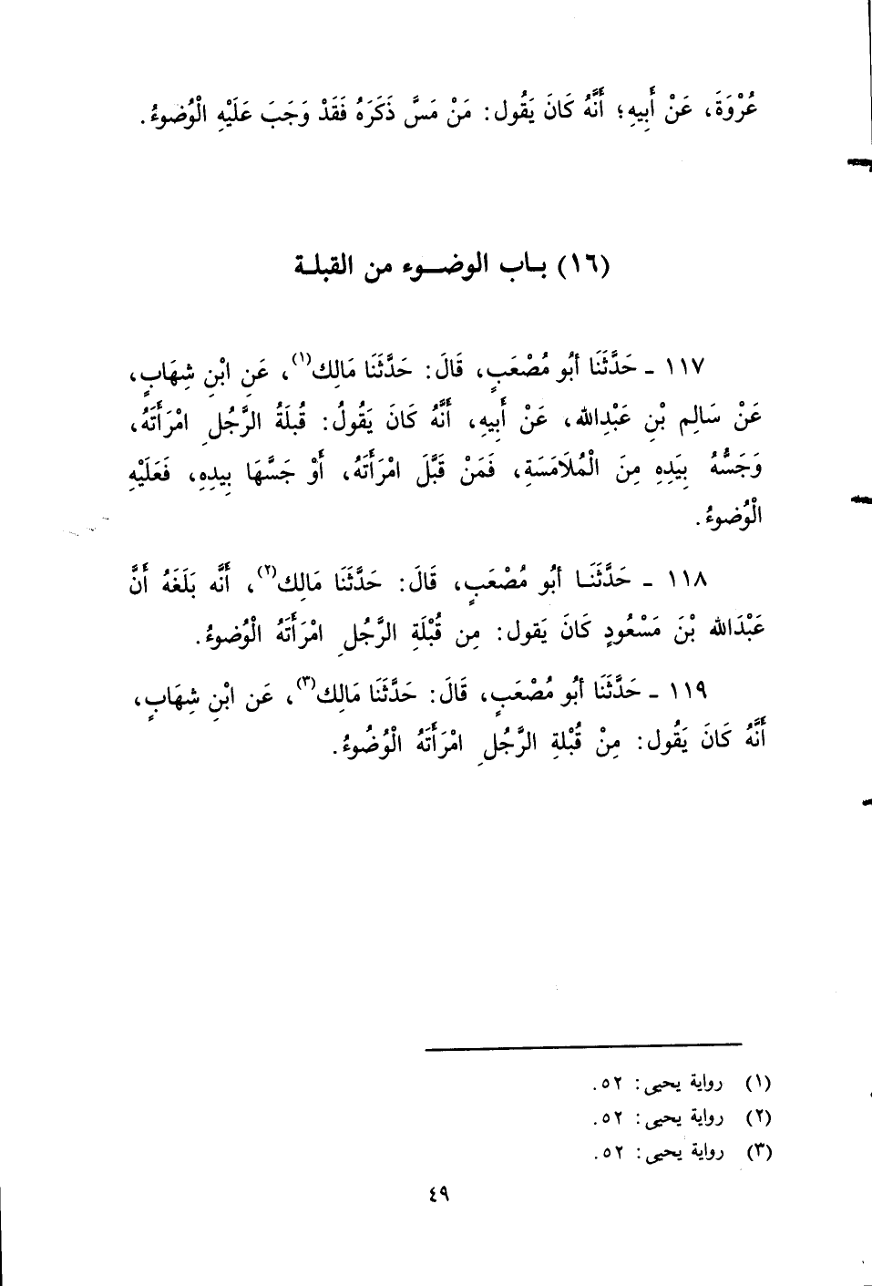 ١١٩ - حَدَّثَنَا أَبُو مُصْعَبٍ، قَالَ: حَدَّثَنَا مَالِكٌ، عَنِ ابْنِ شِهَابٍ، أَنَّهُ كَانَ يَقُولُ: مِنْ قُبْلَةِ الرَّجُلِ امْرَأَتَهُ الْوُضُوءُ.