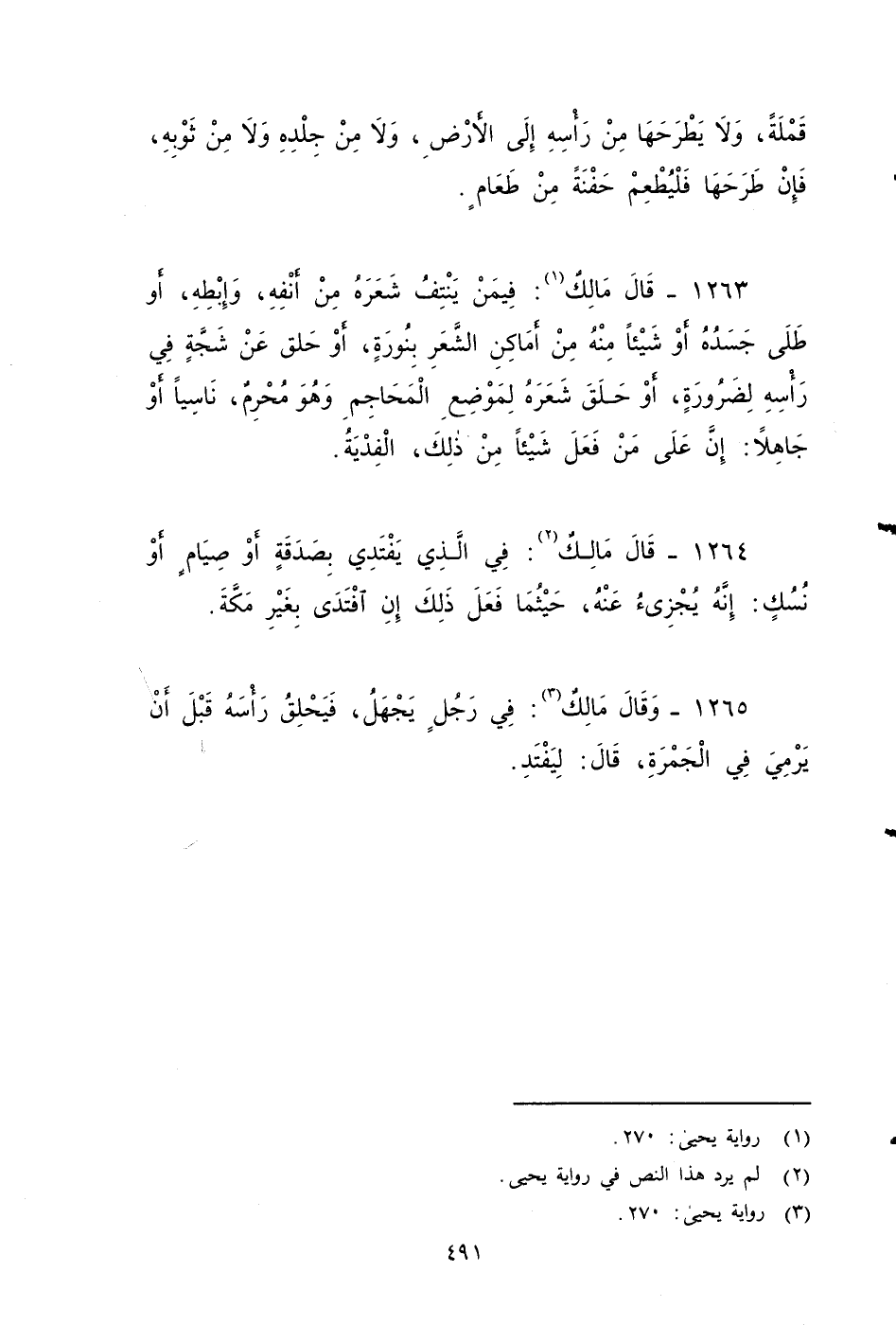 ١٢٦٣ - قَالَ مَالِكٌ: فيمَنْ ينَتَفَ شَعَره مِنْ أَنْفِهِ، وْ إِبْطِهِ، أَوِ طَّلَى جَسَدَهُ أو شيئاً منه من أماكن الشعر بِنُورَةٍ، أَوْحْلِقُ عَنْ شَجَّةٍ فِي رَأْسِهِ لِضَرُورَةٍ، أَوْحْلِقُ شعره لِمَوْضِعِ الْمَحَاجِمِ وَهُوَ مُحْرِمٌ، نَاسِيًا أَوْ جَاهِلاً: إِنَّ على مَنْ فَعَلَ شَيْئًا مِنْ ذَلِكَ الْفِدْيَةُ.