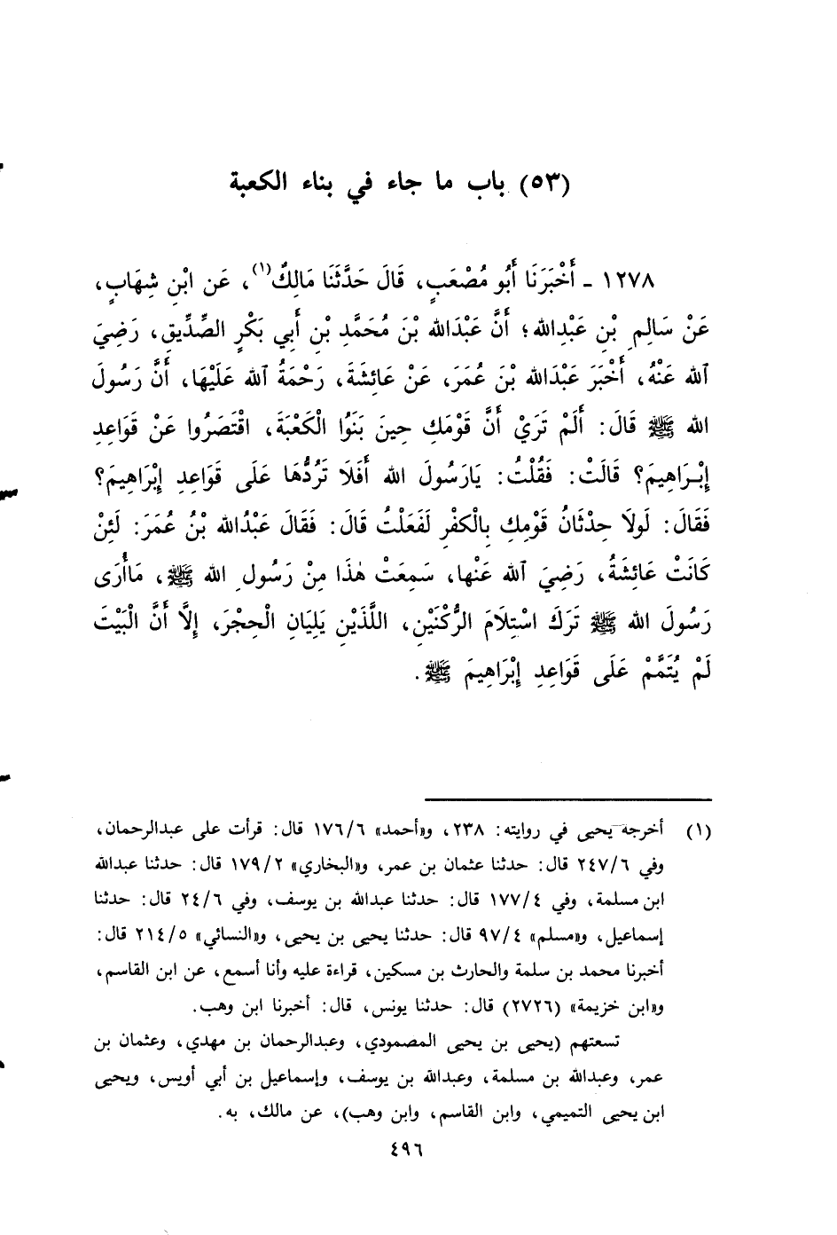 ١٢٧٨ - أخبرنا أَبُو مُصْعَبٍ، قَالَ: حَدَّثَنَا مَالِكٌ، عَنِ ابْنِ شِهَابٍ، عَنْ سَالِمِ بْنِ عَبْدِ اللهِ، أَنَّ عَبْدَ اللهِ بْنَ مُحَمَّدِ بْنِ أَبِي بَكْرٍ الصِّدِّيقِ - رضي الله عنه - , أَخْبَرَ عَبْدَ اللهِ بْنَ عُمَرَ، عَنْ عَائِشَةَ - رحمة الله عليها - , أَنَّ رسول الله صَلَّى اللَّهُ عَلَيْهِ وَسَلَّمَ قَالَ: أَلَمْ تَرَيْ أَنَّ قَوْمَكِ حِينَ بَنَوُا الْكَعْبَةَ اقْتَصَرُوا عَنْ قَوَاعِدِ إِبْرَاهِيمَ؟ قَالَتْ: فَقُلْتُ: يَا رَسُولَ اللهِ، أَفَلَا تَرُدُّهَا عَلَى قَوَاعِدِ إِبْرَاهِيمَ؟ فَقَالَ: لَوْلَا حِدْثَانُ قَوْمِكِ بِالْكُفْرِ لَفَعَلْتُ , قَالَ: فَقَالَ عَبْدُ اللهِ بْنُ عُمَرَ: لَئِنْ كَانَتْ عَائِشَةُ - رضي الله عنها - سَمِعَتْ هَذَا مِنْ رَسُولِ اللهِ صَلَّى اللَّهُ عَلَيْهِ وَسَلَّمَ، مَا أُرَى رَسُولَ اللهِ صَلَّى اللَّهُ عَلَيْهِ وَسَلَّمَ تَرَكَ اسْتِلَامَ الرُّكْنَيْنِ اللَّذَيْنِ يَلِيَانِ الْحِجْرَ، إِلَاّ أَنَّ الْبَيْتَ لَمْ يُتَمَّمْ عَلَى قَوَاعِدِ إِبْرَاهِيمَ صَلى الله عَلَيه وَسَلم.
