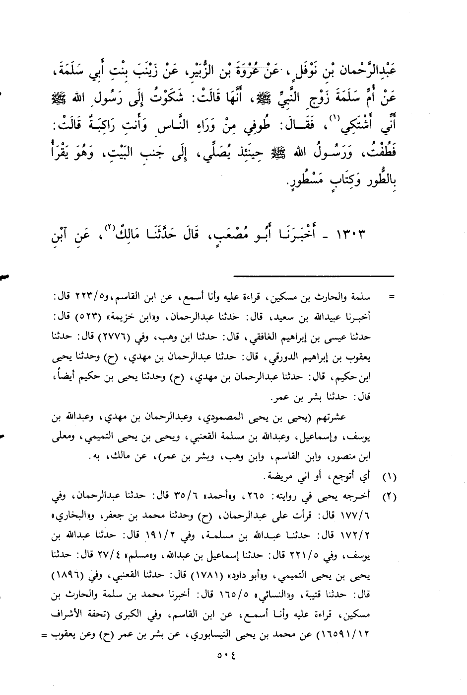 ١٣٠٢ - أَخْبَرَنَا أَبُو مُصْعَبٍ، قَالَ: حَدَّثَنَا مَالِكٌ، عن مُحَمَّدِ بْنِ عَبْدِ الرَّحْمَنِ بْنِ نَوْفَلٍ، عَنْ عُرْوَةَ بْنِ الزُّبَيْرِ، عَنْ زَيْنَبَ بِنْتِ أَبِي سَلَمَةَ، عَنْ أُمِّ سَلَمَةَ زَوْجِ النَّبِيِّ صَلَّى اللَّهُ عَلَيْهِ وَسَلَمَ، أَنَّهَا قَالَتْ: شَكَوْتُ إِلَى رَسُولِ اللَّهِ صَلَّى اللَّهُ عَلَيْهِ وَسَلَمَ أَنِّي أَشْتَكِي، فَقَالَ: طُوفِي مِنْ وَرَاءِ النَّاسِ وَأَنْتِ رَاكِبَةٌ، قَالَتْ: وَرَسُولُ اللَّهِ صَلَّى اللَّهُ عَلَيْهِ وَسَلَمَ حِينَئِذٍ يُصَلِّي، إِلَى جَنِبِ الْبَيْتِ، وَهُوَ يَقْرَأُ: بالطور وَكِتَابٍ مَسْطُورٍ.