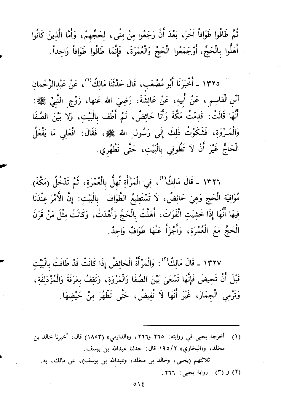١٣٢٥ - أخبرنا أَبُو مُصْعَبٍ، قَالَ: حَدَّثَنَا مَالِكٌ، عَنْ عَبْدِ الرَّحْمَنِ بْنِ الْقَاسِمِ، عَنْ أَبِيهِ، عَنْ عَائِشَةَ - رضي الله عنها - زوج النبي صَلَّى اللَّهُ عَلَيْهِ وَسَلَمَ، أَنَّهَا قَالَتْ: قَدِمْتُ مَكَّةَ، وَأَنَا حَائِضٌ، فَلَمْ أَطُفْ بِالْبَيْتِ، وَلَا بَيْنَ الصَّفَا وَالْمَرْوَةِ، فَشَكَوْتُ ذَلِكَ إِلَى رَسُولِ اللَّهِ صَلَّى اللَّهُ عَلَيْهِ وَسَلَمَ، فَقَالَ: افْعَلِي مَا يَفْعَلُ الْحَاجُّ غَيْرَ أَنْ لا تَطُوفِي بِالْبَيْتِ حَتَّى تَطْهُرِي.