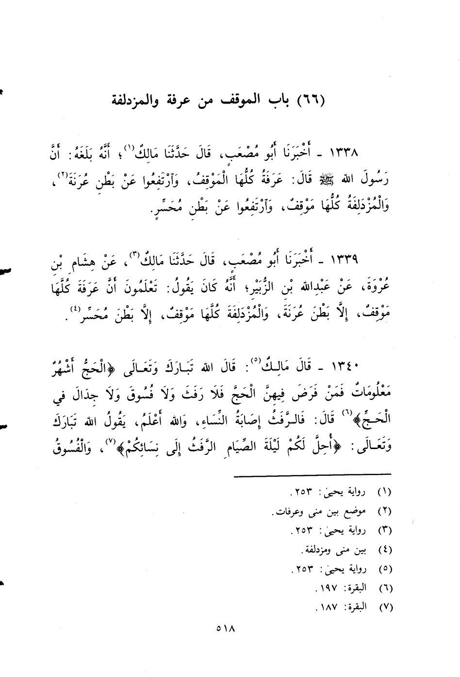 ١٣٣٨ - أخبرنا أَبُو مُصْعَبٍ، قَالَ: حَدَّثَنَا مَالِكٌ؛ أَنَّهُ بَلَغَهُ؛ أَنَّ رَسُولَ اللهِ صَلَّى اللَّهُ عَلَيْهِ وَسَلَّمَ قَالَ: عَرَفَةُ كُلُّهَا المَوْقِفٌ، وَارْتَفِعُوا عَنْ بَطْنِ عُرَنَةَ، وَالْمُزْدَلِفَةُ كُلُّهَا مَوْقِفٌ، وَارْتَفِعُوا عَنْ بَطْنِ مُحَسِّرٍ.