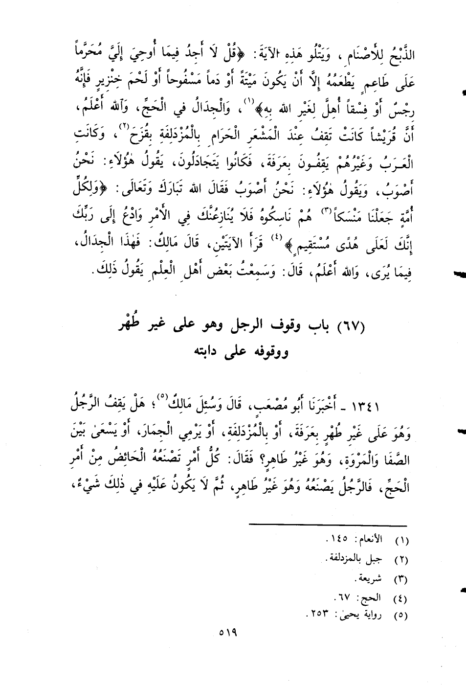 ١٣٤١ - أخبرنا أَبُو مُصْعَبٍ، قَالَ: وسُئِلَ مَالِكٌ: هَلْ يَقِفُ الرَّجُلُ وهو على غير طُهْر بِعَرَفَةَ، أَوْ بِالْمُزْدَلِفَةِ، أَوْ يَرْمِي الْجِمَارَ، أَوْ يَسْعَى بَيْنَ الصَّفَا وَالْمَرْوَةِ، وَهُوَ غَيْرُ طَاهِرٍ؟ فَقَالَ: كُلُّ أَمْرٍ تَصْنَعُهُ الْحَائِضُ مِنْ أَمْرِ الْحَجِّ، فَالرَّجُلُ يَصْنَعُهُ وَهُوَ غَيْرُ طَاهِرٍ، ثُمَّ لَا يَكُونُ عَلَيْهِ شَيْءٌ فِي ذَلِكَ، وَالْفَضْلُ في أَنْ يَكُونَ الرَّجُلُ فِي ذَلِكَ كُلِّهِ طَاهِرًا، وَلَا يَنْبَغِي لَهُ أَنْ يَتَعَمَّدَ ذَلِكَ.