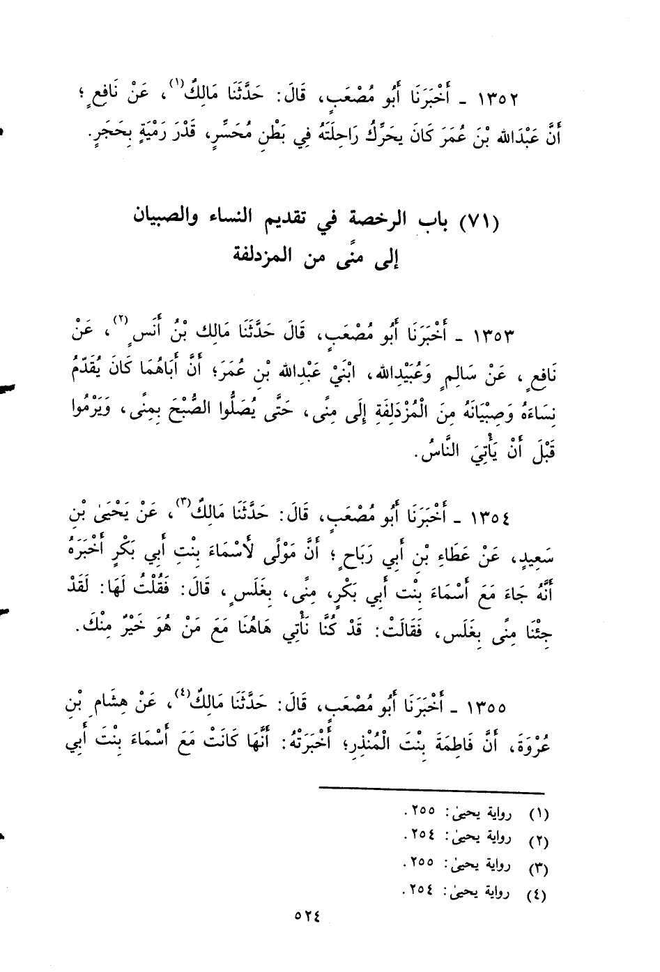 ١٣٥٥ - أخبرنا أَبُو مُصْعَبٍ، قَالَ: حَدَّثَنَا مَالِكٌ، عَنْ هِشَامِ بْنِ عُرْوَةَ، أَنَّ فَاطِمَةَ بِنْتِ الْمُنْذِرِ أَخْبَرَتْهُ: أَنَّهَا كَانَتْ مع أَسْمَاءَ بِنْتَ أَبِي بَكْرٍ الصديق في الحج فإنها كانت ترى أسماء بِالْمُزْدَلِفَةِ تَأْمُرُ الَّذِي يُصَلِّي لَهَا وَلأَصْحَابِهَاأن يُصَلِّي بهُمُ الصُّبْحَ حِينَ يَطْلُعُ الْفَجْرُ، ثُمَّ تَرْكَبُ فَتَسِيرُ إِلَى مِنًى وَلَا تَقِفُ.