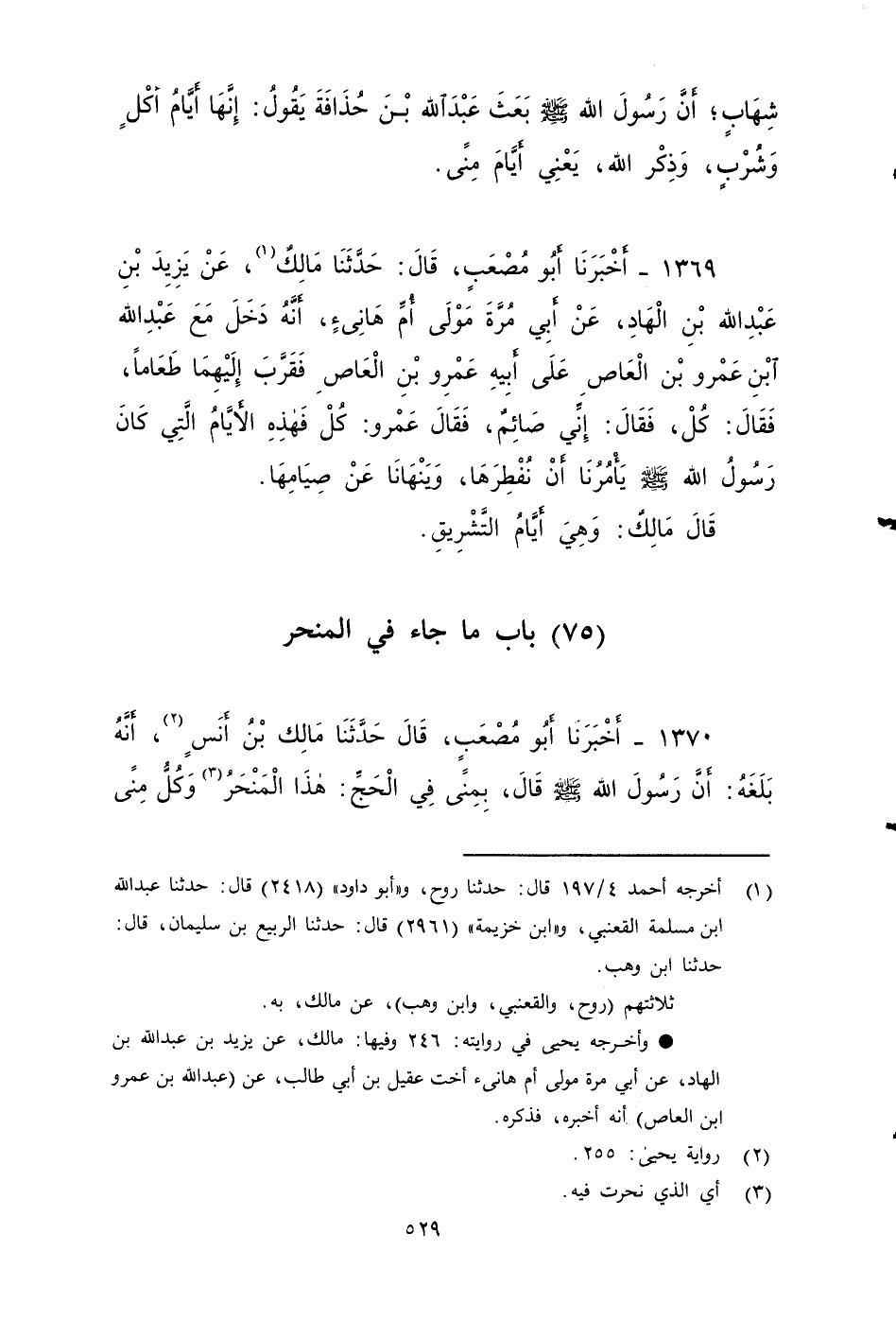 ١٣٧٠ - أخبرنا أَبُو مُصْعَبٍ، قَالَ: حَدَّثَنَا مَالِكٌ بن أنس؛ أَنَّهُ بَلَغَهُ، أَنَّ رَسُولَ اللهِ صَلَّى اللَّهُ عَلَيْهِ وَسَلَّمَ قَالَ بِمِنًى في الحج: هَذَا الْمَنْحَرُ , وَكُلُّ مِنًى مَنْحَرٌ، وَقَالَ فِي الْعُمْرَةِ: الْمَرْوَةَ مَنْحَرُ، وَكُلُّ فِجَاجِ مَكَّةَ وَطُرُقِهَا مَنْحَرٌ.