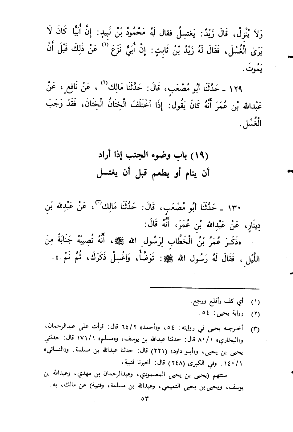 ١٣٠ - حَدَّثَنَا أَبُو مُصْعَبٍ، قَالَ: حَدَّثَنَا مَالِكٌ، عَنْ عَبْدِ اللَّهِ بْنِ دِينَارٍ، عَنْ عَبْدِ اللَّهِ بْنِ عُمَرَ، أَنَّهُ قَالَ: ذَكَرَ عُمَرُ بْنُ الْخَطَّابِ لِرَسُولِ اللَّهِ صَلى الله عَلَيه وَسَلم أَنَّهُ تصِيبُهُ جَنَابَةٌ مِنَ اللَّيْلِ، فَقَالَ لَهُ رَسُولُ اللَّهِ صَلى الله عَلَيه وَسَلم: تَوَضَّأْ وَاغْسِلْ ذَكَرَكَ ثُمَّ نَمْ.