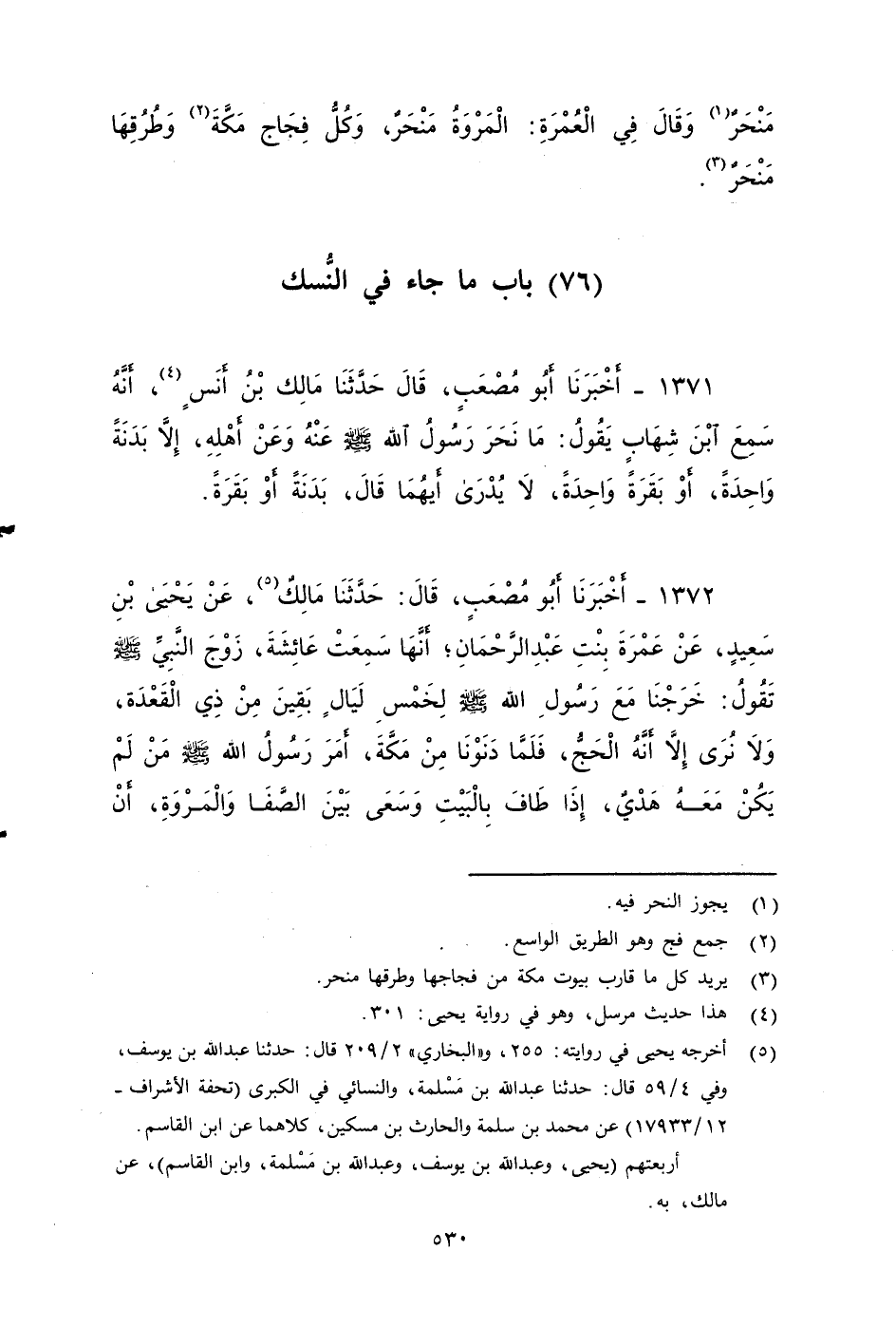 ١٣٧٢ - أخبرنا أَبُو مُصْعَبٍ، قَالَ: حَدَّثَنَا مَالِكٌ، عَنْ يَحْيَى بْنِ سَعِيدٍ، عن عَمْرَةَ بِنْتِ عَبْدِ الرَّحْمَنِ، أَنَّهَا سَمِعَتْ عَائِشَةَ زوج النبي صَلَّى اللَّهُ عَلَيْهِ وَسَلَمَ، تَقُولُ: خَرَجْنَا مَعَ رَسُولِ اللَّهِ صَلَّى اللَّهُ عَلَيْهِ وَسَلَمَ لِخَمْسِ لَيَالٍ بَقِينَ مِنْ ذِي الْقَعْدَةِ، وَلَا نُرَى إِلَّا أَنَّهُ الْحَجُّ، فَلَمَّا دَنَوْنَا مِنْ مَكَّةَ: أَمَرَ رَسُولُ اللَّهِ صَلَّى اللَّهُ عَلَيْهِ وَسَلَمَ مَنْ لَمْ يَكُنْ مَعَهُ هَدْيٌ، إِذَا طَافَ بِالْبَيْتِ، وَسَعَى بَيْنَ الصَّفَا وَالْمَرْوَةِ، أَنْ يَحِلَّ، قَالَتْ عَائِشَةُ: فَدُخِلَ عَلَيْنَا يَوْمَ النَّحْرِ بِلَحْمِ بَقَرٍ، فَقُلْتُ: مَا هَذَا؟ فَقَالُوا: نَحَرَ رَسُولُ اللَّهِ صَلَّى اللَّهُ عَلَيْهِ وَسَلَمَ، عَنْ أَزْوَاجِهِ.