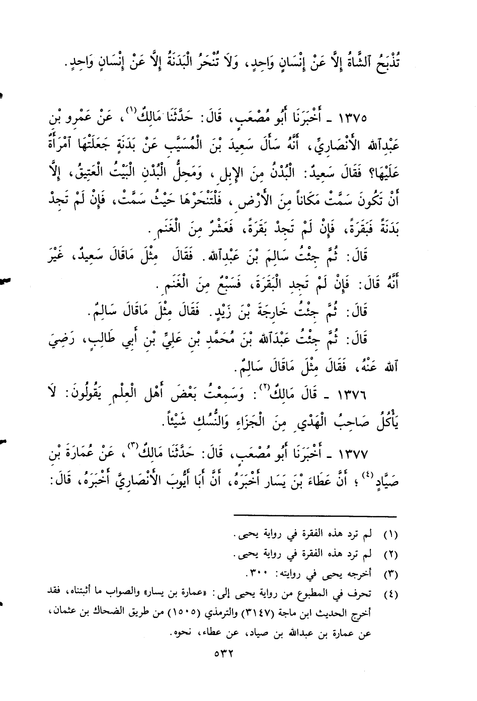 ١٣٧٥ - أخبرنا أَبُو مُصْعَبٍ، قَالَ: حَدَّثَنَا مَالِكٌ، عَنْ عَمْرِو بْنِ عَبْدِ اللهِ الأَنْصَارِيِّ , أَنَّهُ سَأَلَ سَعِيدَ بْنَ الْمُسَيَّبِ عَنْ بَدَنَةٍ جَعَلَتْهَا امْرَأَةٌ عَلَيْهَا؟ فَقَالَ سَعِيدٌ: الْبُدْنُ مِنَ الإِبِلِ، وَمَحِلُّ الْبُدْنِ الْبَيْتُ الْعَتِيقُ، إِلَاّ أَنْ تَكُونَ سَمَّتْ مَكَانًا مِنَ الأَرْضِ، فَلْتَنْحَرْهَا حَيْثُ سَمَّتْ , فَإِنْ لَمْ تَجِدْ بَدَنَةً فَبَقَرَةٌ , فَإِنْ لَمْ تَجِدْ بَقَرَةً، فَعَشْرٌ مِنَ الْغَنَمِ.