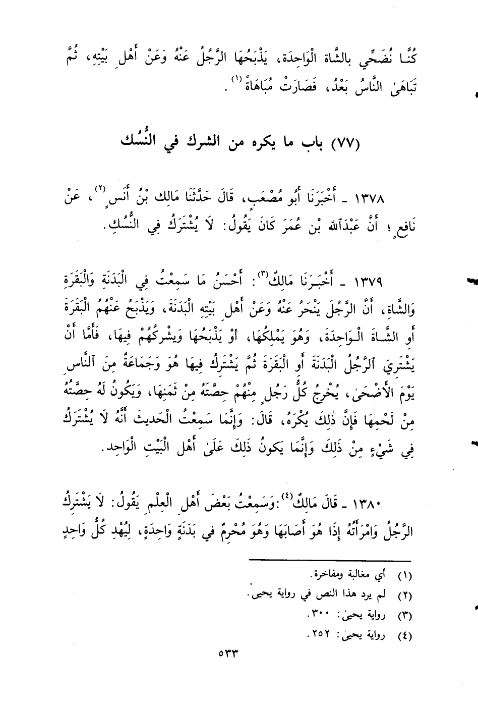 ١٣٧٨ - أخبرنا أَبُو مُصْعَبٍ، قَالَ: حَدَّثَنَا مَالِكٌ بن أنس، عَنْ نَافِعٍ , أَنَّ عَبْدَ اللهِ بْنَ عُمَرَ كَانَ يَقُولُ: لَا يُشْتَرَكُ فِي النُّسُكِ.