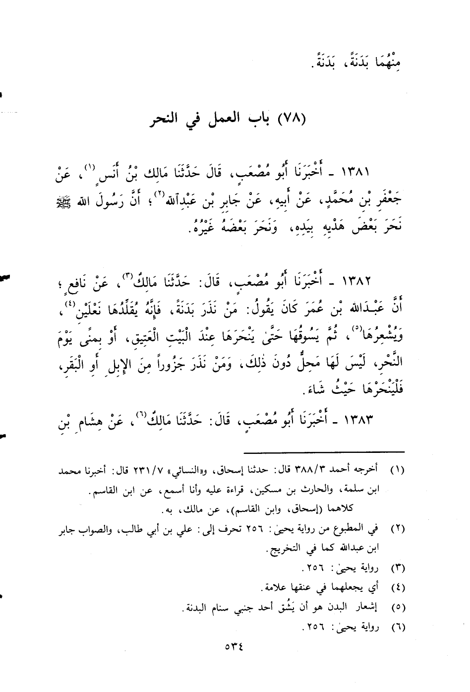 ١٣٨٣ - أخبرنا أَبُو مُصْعَبٍ، قَالَ: حَدَّثَنَا مَالِكٌ، عَنْ هِشَامِ بْنِ عُرْوَةَ، أَنَّ أَبَاهُ كَانَ يَنْحَرُ بُدْنَهُ قِيَامًا.