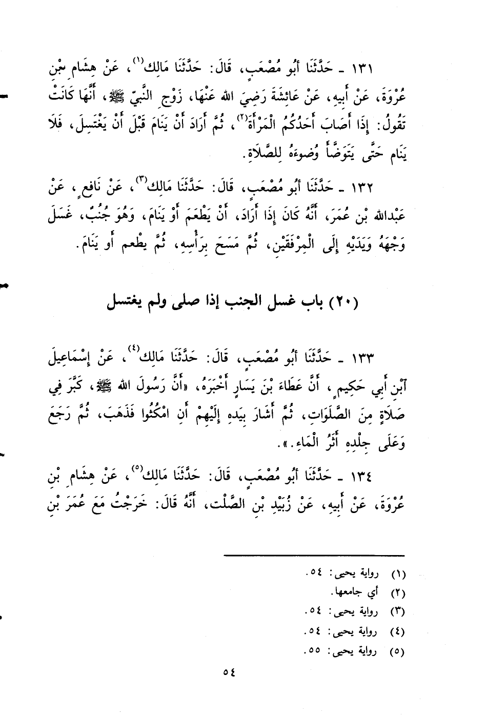 ١٣٢ - حَدَّثَنَا أَبُو مُصْعَبٍ، قَالَ: حَدَّثَنَا مَالِكٌ، عَنْ نَافِعٍ، عن عَبْدَ اللهِ بْنَ عُمَرَأنه كَانَ إِذَا أَرَادَ أَنْ يَطْعَمَ أَوْيَنَام وَهُوَ جُنُبٌ غَسَلَ وَجْهَهُ وَيَدَيْهِ إِلَى الْمِرْفَقَيْنِ، ثُمَّ مَسَحَ بِرَأْسِهِ، ثم يطَعِمَ , أَوْ ينَامَ.