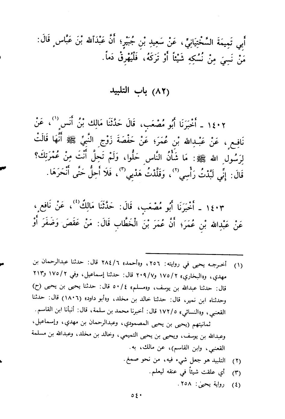 ١٤٠٣ - أخبرنا أَبُو مُصْعَبٍ، قَالَ: حَدَّثَنَا مَالِكٌ، عَنْ نَافِعٍ، عَنْ عَبْدِ اللهِ بْنِ عُمَرَ؛ أَنَّ عُمَرَ بْنَ الْخَطَّابِ قَالَ: مَنْ عقص وضَفَرَ أو لبد , فَلْيَحْلِقْ، وَلَا تَشَبَّهُوا بِالتَّلْبِيدِ.