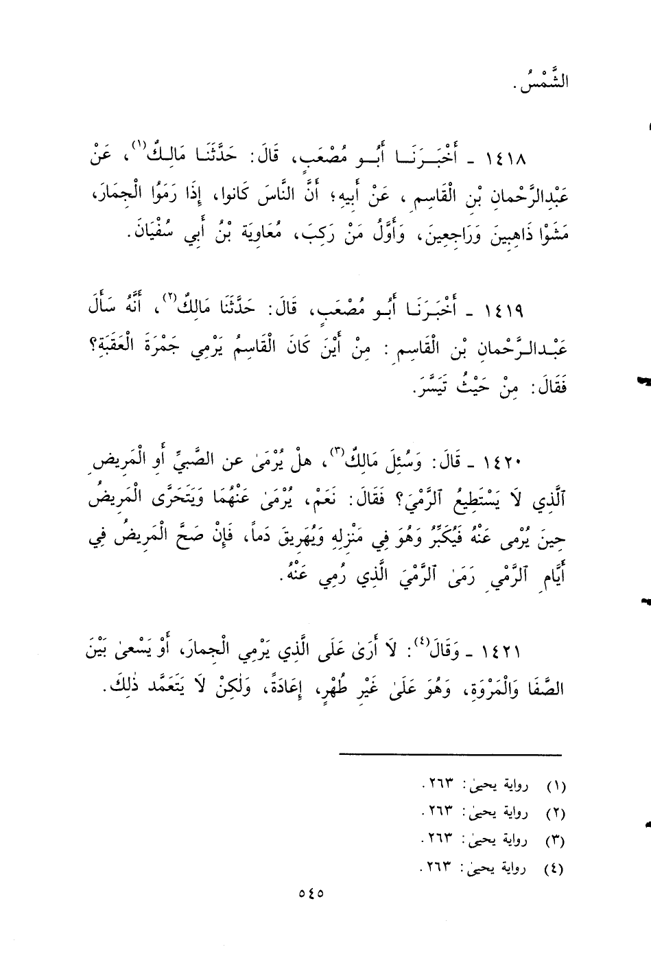 ١٤١٨ - أخبرنا أَبُو مُصْعَبٍ، قَالَ: حَدَّثَنَا مَالِكٌ، عَنْ عَبْدِ الرَّحْمَنِ بْنِ الْقَاسِمِ، عَنْ أَبِيهِ، أَنَّ النَّاسَ كَانُوا إِذَا رَمَوُا الْجِمَارَ، مَشَوْا ذَاهِبِينَ وَرَاجِعِينَ، وَأَوَّلُ مَنْ رَكِبَ، مُعَاوِيَةُ بْنُ أَبِي سُفْيَانَ.