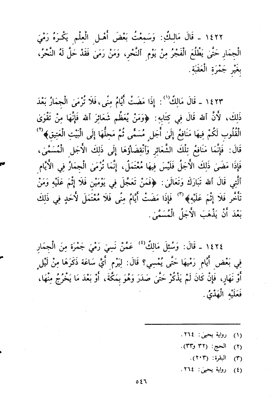 ١٤٢٣ - قَالَ مَالِكٌ: إِذَا مَضَتْ أَيَّامُ مِنًى، فَلَا تُرْمَى الْجِمَارُ بَعْدَ ذَلِكَ، لأَنَّ اللهَ قَالَ فِي كِتَابِهِ: {وَمَنْ يُعَظِّمْ شَعَائِرَ اللَّهِ فَإِنَّهَا مِنْ تَقْوَى الْقُلُوبِ لَكُمْ فِيهَا مَنَافِعُ إِلَى أَجَلٍ مُسَمًّى ثُمَّ مَحِلُّهَا إِلَى الْبَيْتِ الْعَتِيقِ} قَالَ: فَإِنَّمَا مَنَافِعُ تِلْكَ الشَّعَائِرِ وَانْقِضَاؤُهَا إِلَى ذَلِكَ الأَجَلِ الْمُسَمَّى، فَإِذَا مَضَى ذَلِكَ الأَجَلُ فَلَيْسَ فِيهِ مُعْتَمَلٌ، إِنَّمَا تُرْمَى الْجِمَارُ فِي الأَيَّامِ الَّتِي قَالَ اللَّهُ تَبَارَكَ وَتَعَالَى: {فَمَنْ تَعَجَّلَ فِي يَوْمَيْنِ فَلَا إِثْمَ عَلَيْهِ وَمَنْ تَأَخَّرَ فَلَا إِثْمَ عَلَيْهِ} فَإِذَا مَضَتْ أَيَّامُ مِنًى، فَلَا مُعْتَمَلَ لأَحَدٍ فِي ذَلِكَ بَعْدَ أَنْ يَذْهَبَ الأَجَلُ الْمُسَمَّى.