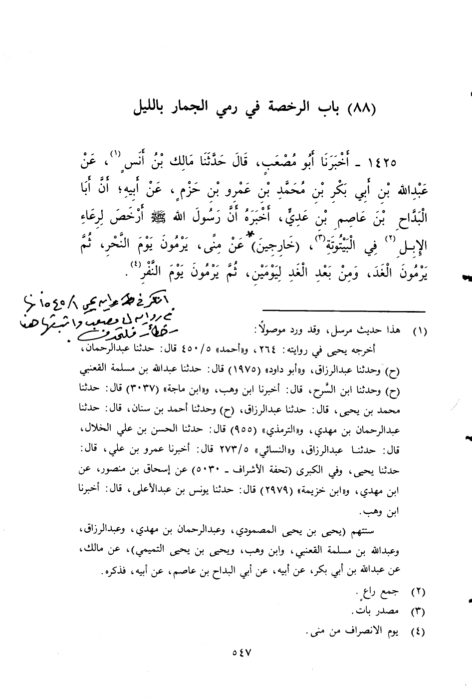 ١٤٢٥ - أخبرنا أَبُو مُصْعَبٍ، قَالَ: حَدَّثَنَا مَالِكٌ بن أنس، عَنْ عَبْدِ اللَّهِ بْنِ أَبِي بَكْرِ بن محمد بن عمرو بْنِ حَزْمٍ، عَنْ أَبِيهِ، أَنَّ أَبَا الْبَدَّاحِ بْنَ عَاصِمِ بْنِ عَدِيٍّ أَخْبَرَهُ، أَنَّ رَسُولَ اللَّهِ صَلَّى اللَّهُ عَلَيْهِ وَسَلَمَ أَرْخَصَ لِرِعَاءِ الْإِبِلِ فِي الْبَيْتُوتَةِ، خَارِجِينَ عَنْ مِنًى، يَرْمُونَ يَوْمَ النَّحْرِ، ثُمَّ يَرْمُونَ الْغَدَ، وَمِنْ بَعْدِ الْغَدِ لِيَوْمَيْنِ، ثُمَّ يَرْمُونَ يَوْمَ النَّفْرِ.