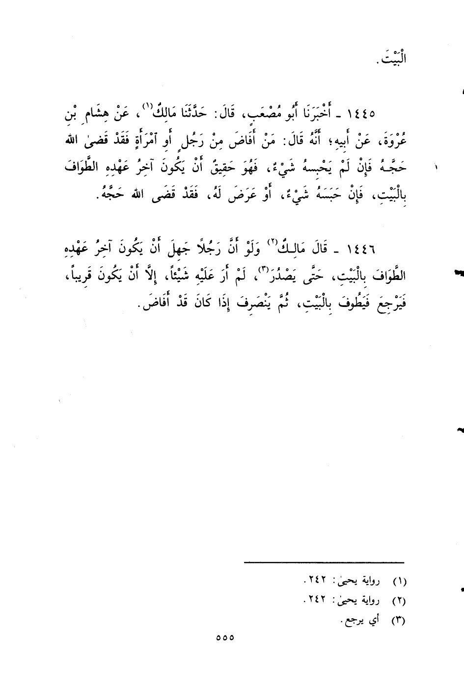 ١٤٤٥ - أخبرنا أَبُو مُصْعَبٍ، قَالَ: حَدَّثَنَا مَالِكٌ، عَنْ هِشَامِ بْنِ عُرْوَةَ، عَنْ أَبِيهِ، أَنَّهُ قَالَ: مَنْ أَفَاضَ من رجل أو امرأة فَقَدْ قَضَى اللَّهُ حَجَّهُ، فَإِنَّ لَمْ يحَبَسَهُ شَيْءٌ، فَهُوَ حَقِيقٌ أَنْ يَكُونَ آخِرُ عَهْدِهِ الطَّوَافَ بِالْبَيْتِ، فإِنْ حَبَسَهُ شَيْءٌ، أَوْ عَرَضَ لَهُ , فَقَدْ قَضَى اللَّهُ حَجَّه.