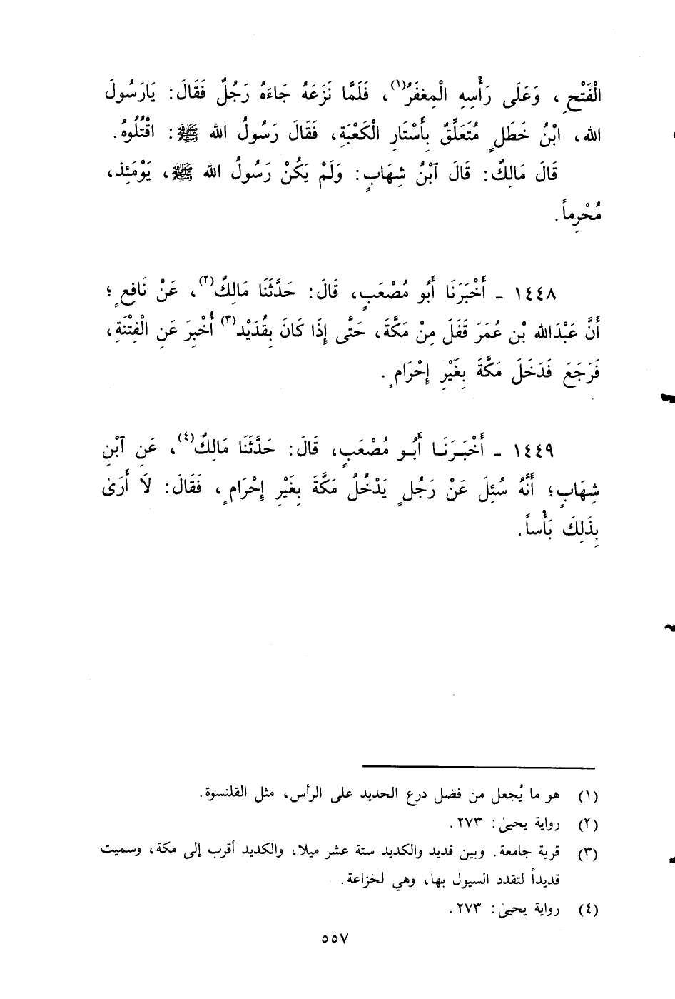 ١٤٤٨ - أخبرنا أَبُو مُصْعَبٍ، قَالَ: حَدَّثَنَا مَالِكٌ، عَنْ نَافِعٍ، أَنَّ عَبْدَ اللهِ بْنَ عُمَرَ قْفلَ مِنْ مَكَّةَ، حَتَّى إِذَا كَانَ بِقُدَيْدٍ , أخَبَرٌ عنَ الْفتنةِ، فَرَجَعَ , فَدَخَلَ مَكَّةَ بِغَيْرِ إِحْرَامٍ.