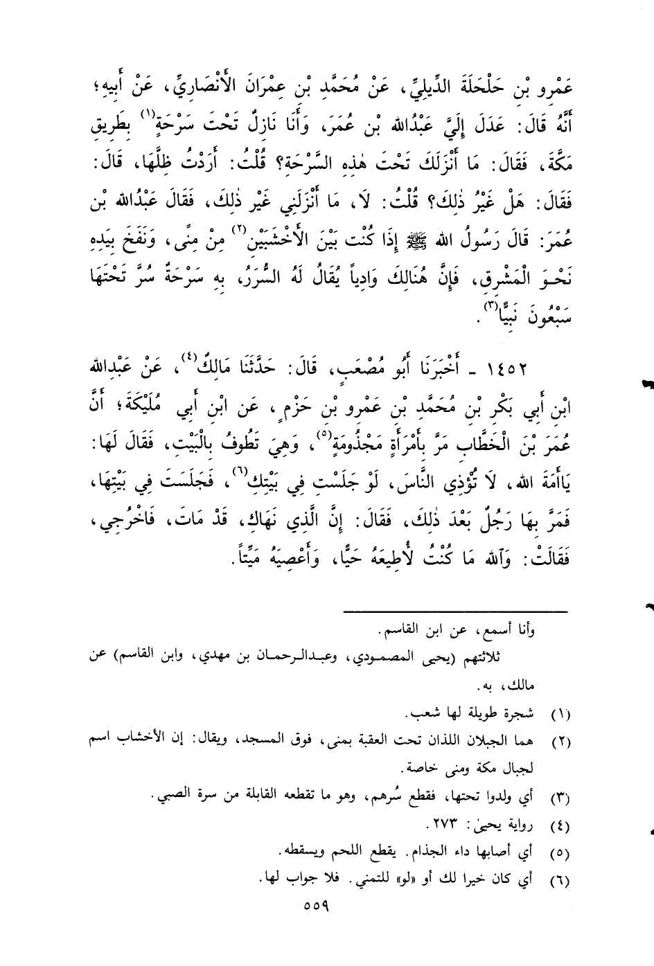 ١٤٥١ - أخبرنا أَبُو مُصْعَبٍ، قَالَ: حَدَّثَنَا مَالِكٌ، عَنْ مُحَمَّدِ بْنِ عَمْرِو بْنِ حَلْحَلَةَ الدِّيلِيِّ، عَنْ مُحَمَّدِ بْنِ عِمْرَانَ الأَنْصَارِيِّ، عَنْ أَبِيهِ، أَنَّهُ قَالَ: عَدَلَ إِلَيَّ عَبْدُ اللَّهِ بْنُ عُمَرَ، وَأَنَا نَازِلٌ تَحْتَ سَرْحَةٍ بِطَرِيقِ مَكَّةَ، فَقَالَ: مَا أَنْزَلَكَ تَحْتَ هَذِهِ السَّرْحَةِ؟ قُلْتُ: أَرَدْتُ ظِلَّهَا، فَقَالَ: هَلْ غَيْرُ ذَلِكَ؟ فَقُلْتُ: لا، مَا أَنْزَلَنِي غير ذَلِكَ، فَقَالَ عَبْدُ اللَّهِ بْنُ عُمَرَ: قَالَ رَسُولُ اللَّهِ صَلَّى اللَّهُ عَلَيْهِ وَسَلَمَ: إِذَا كُنْتَ بَيْنَ الأَخْشَبَيْنِ مِنْ مِنًى، وَنَفَخَ بِيَدِهِ نَحْوَ الْمَشْرِقِ، فَإِنَّ هُنَالكَ وَادِيًا، يُقَالُ لَهُ: السِّرَرُ، بِهِ سرَحةٌ سُرَّ تَحْتَهَا سَبْعُونَ نَبِيًّا.