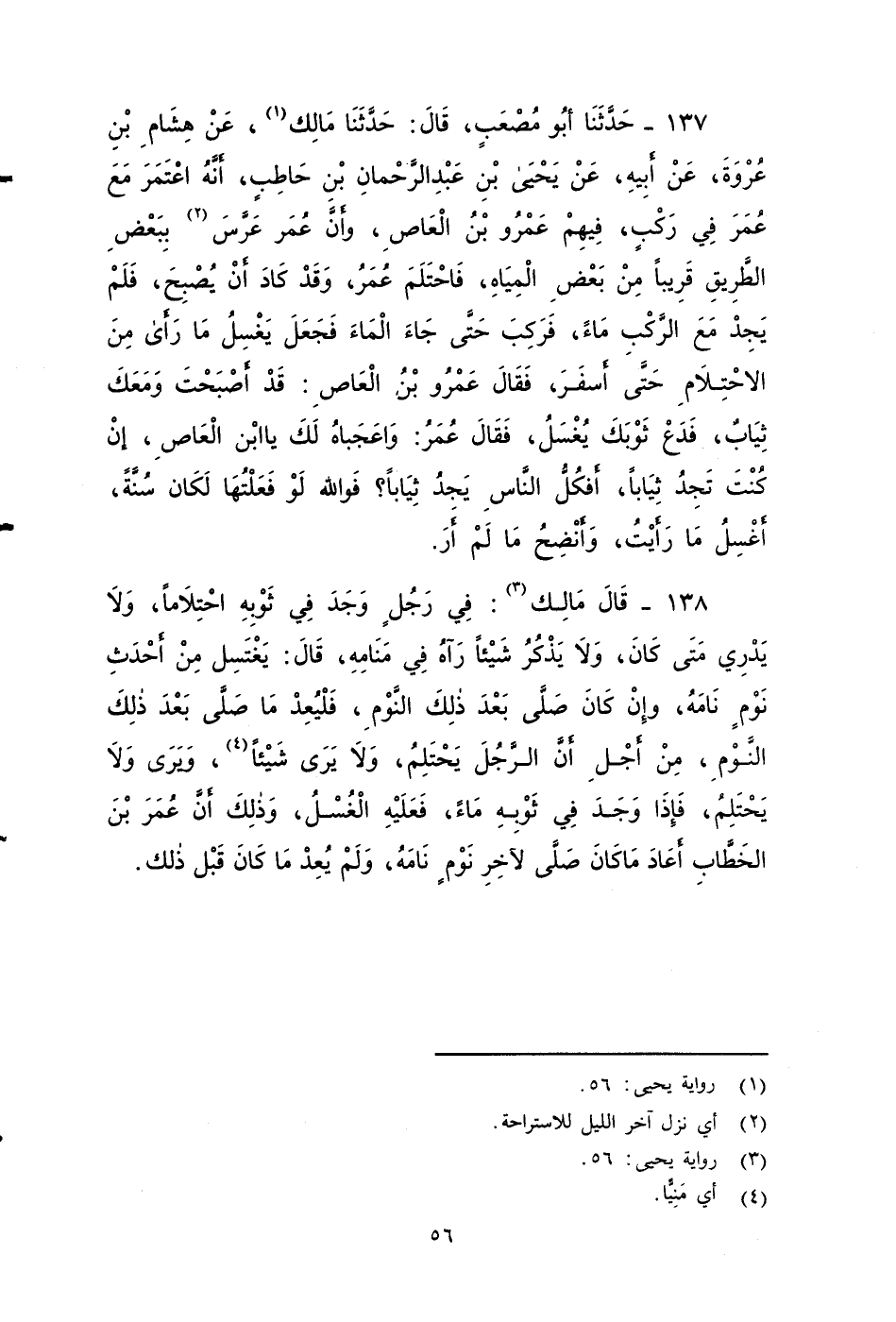 ١٣٧ - حَدَّثَنَا أَبُو مُصْعَبٍ، قَالَ: حَدَّثَنَا مَالِكٌ، عَنْ هِشَامِ بْنِ عُرْوَةَ، عَنْ أَبِيهِ، عَنْ يَحْيَى بْنِ عَبْدِ الرَّحْمَنِ بْنِ حَاطِبٍ، أَنَّهُ اعْتَمَرَ مَعَ عُمَرَ فِي رَكْبٍ فِيهِمْ عَمْرُو بْنُ الْعَاصِ، وَأَنَّ عُمَرَ عَرَّسَ بِبَعْضِ الطَّرِيقِ قَرِيبًا مِنْ بَعْضِ الْمِيَاهِ، فَاحْتَلَمَ عُمَرُ وَقَدْ كَادَ أَنْ يُصْبِحَ، فَلَمْ يَجِدْ مَعَ الرَّكْبِ مَاءً، فَرَكِبَ، حَتَّى جَاءَ الْمَاءَ، فَجَعَلَ يَغْسِلُ مَا رَأَى مِنْ الاِحْتِلَامِ، حَتَّى أَسْفَرَ، فَقَالَ عَمْرُو بْنُ الْعَاصِ: قد أَصْبَحْتَ وَمَعَك ثِيَابٌ، فَدَعْ ثَوْبَكَ يُغْسَلُ، فَقَالَ عُمَرُ: وَاعَجَبًاه لَكَ يَا ابْنَ الْعَاصِ , إنْ كُنْتَ تَجِدُ ثِيَابًا أَفَكُلُّ النَّاسِ يَجِدُ ثِيَابًا؟ فوَاللَّهِ لَوْ فَعَلْتُهَا لَكَانَ سُنَّةً، أَغْسِلُ مَا رَأَيْتُ، وَأَنْضِحُ مَا لَمْ أَرَ.