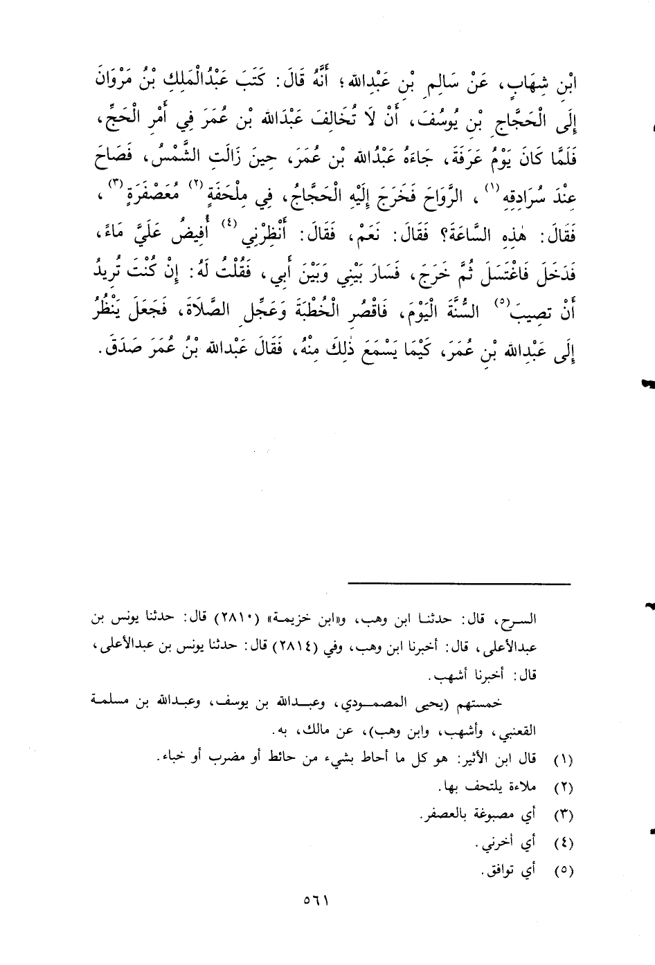 ١٤٥٥ - أخبرنا أَبُو مُصْعَبٍ، قَالَ: حَدَّثَنَا مَالِكٌ بن أنس، عَنِ ابْنِ شِهَابٍ، عَنْ سَالِمِ بْنِ عَبْدِ اللهِ، أَنَّهُ قَالَ: كَتَبَ عَبْدُ الْمَلِكِ بْنُ مَرْوَانَ إِلَى الحَجَّاجِ بْنِ يُوسُفَ: أَنْ لَا تخَالِفَ عَبْدَ اللهِ بْنَ عُمَرَ فِي أَمْرِ الْحَجِّ , فَلَمَّا كَانَ يَوْمُ عَرَفَةَ , جَاءَهُ عَبْدُ اللهِ بْنُ عُمَرَ حِينَ زَالَتِ الشَّمْسُ , فَصَاحَ عِنْدَ سُرَادِقِهِ الرواح فَخَرَجَ إِلَيْهِ الحَجَّاجُ , في مِلْحَفَةٌ مُعَصْفَرَةٌ، فَقَالَ: هَذِهِ السَّاعَةَ؟ فقَالَ: نَعَمْ، فقَالَ: أَنْظِرْنِي أُفِيضَ عَلَيَّ مَاءً ,فدخل فاغتسل ثُمَّ خْرُجَ , فَسَارَ بَيْنِي وَبَيْنَ أَبِي، فَقُلْتُ لَهُ: إِنْ كُنْتَ تُرِيدُ أَنْ تُصِيبَ السُّنَّةَ الْيَوْمَ , فَاقْصُرِ الْخُطْبَةَ , وَعَجِّلِ الصَّلَاةَ , فَجَعَلَ يَنْظُرُ إِلَى عَبْدِ اللهِ بْنِ عُمَرَ كَيْمَا يَسْمَعَ ذَلِكَ مِنْهُ ,فقال عَبْدُ اللهِ بن عمر: صَدَقَ.