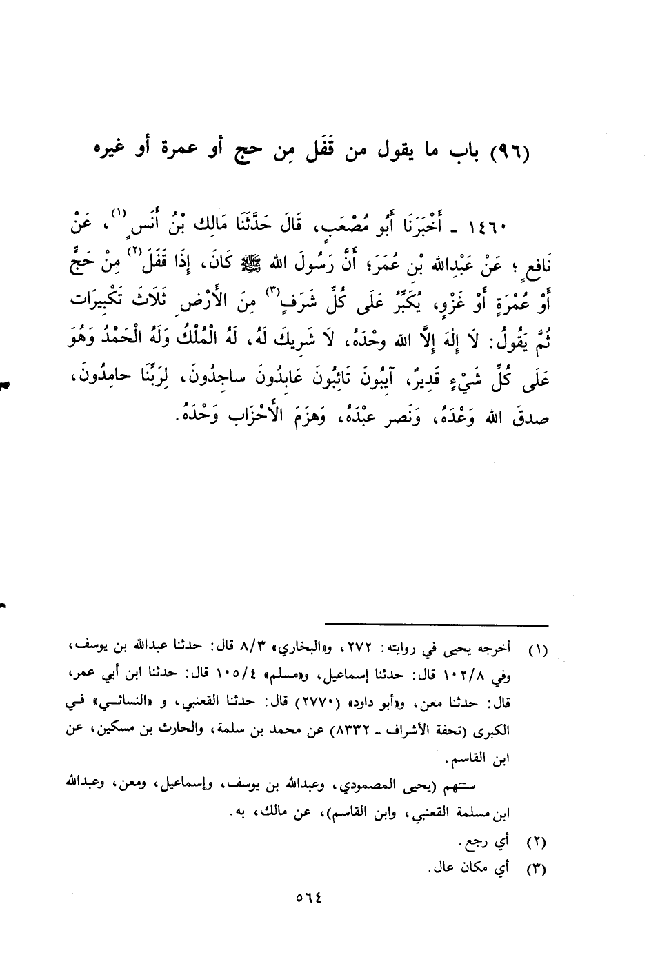 ١٤٦٠ - أخبرنا أَبُو مُصْعَبٍ، قَالَ: حَدَّثَنَا مَالِكٌ بن أنس، عَنْ نَافِعٍ، عَنْ عَبْدِ اللهِ بْنِ عُمَرَ؛ أَنَّ رَسُولَ اللهِ صَلَّى اللَّهُ عَلَيْهِ وَسَلَّمَ كَانَ إِذَا قَفَلَ مِنْ حَجٍّ أَوْ عُمْرَةٍ أَوْغَزْوٍ , يُكَبِّرُ عَلَى كُلِّ شَرَفٍ مِنَ الأََرْضِ ثَلَاثَ تَكْبِيرَاتٍ , ثُمَّ يَقُولُ: لَا إِلَهَ إِلَاّ اللَّهُ , وَحْدَهُ لَا شَرِيكَ لَهُ، لَهُ الْمُلْكُ وَلَهُ الْحَمْدُ، وَهُوَ عَلَى كُلِّ شَيْءٍ قَدِيرٌ، آيِبُونَ تَائِبُونَ عَابِدُونَ سَاجِدُونَ، لِرَبِّنَا حَامِدُونَ، صَدَقَ اللَّهُ وَعْدَهُ، وَنَصَرَ عَبْدَهُ، وَهَزَمَ الأََحْزَابَ وَحْدَهُ.