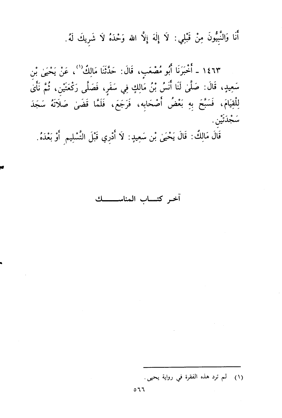 ١٤٦٣ - أخبرنا أبو مصعب قَالَ: حَدَّثَنَا مَالِكٌ، عَنْ يَحْيَى بْنِ سَعِيدٍ، قَالَ: صَلَّى لَنَا أَنَسِ بْنِ مَالِكٍ في سفر، فَصَلَّى رَكْعَتَيْنِ، ثم نأى للقيام، فسبح به بعض أصحابه، فرجع، فَلَمَّا قَضَى صَلَاتَهُ سَجَدَ سَجْدَتَيْنِ.