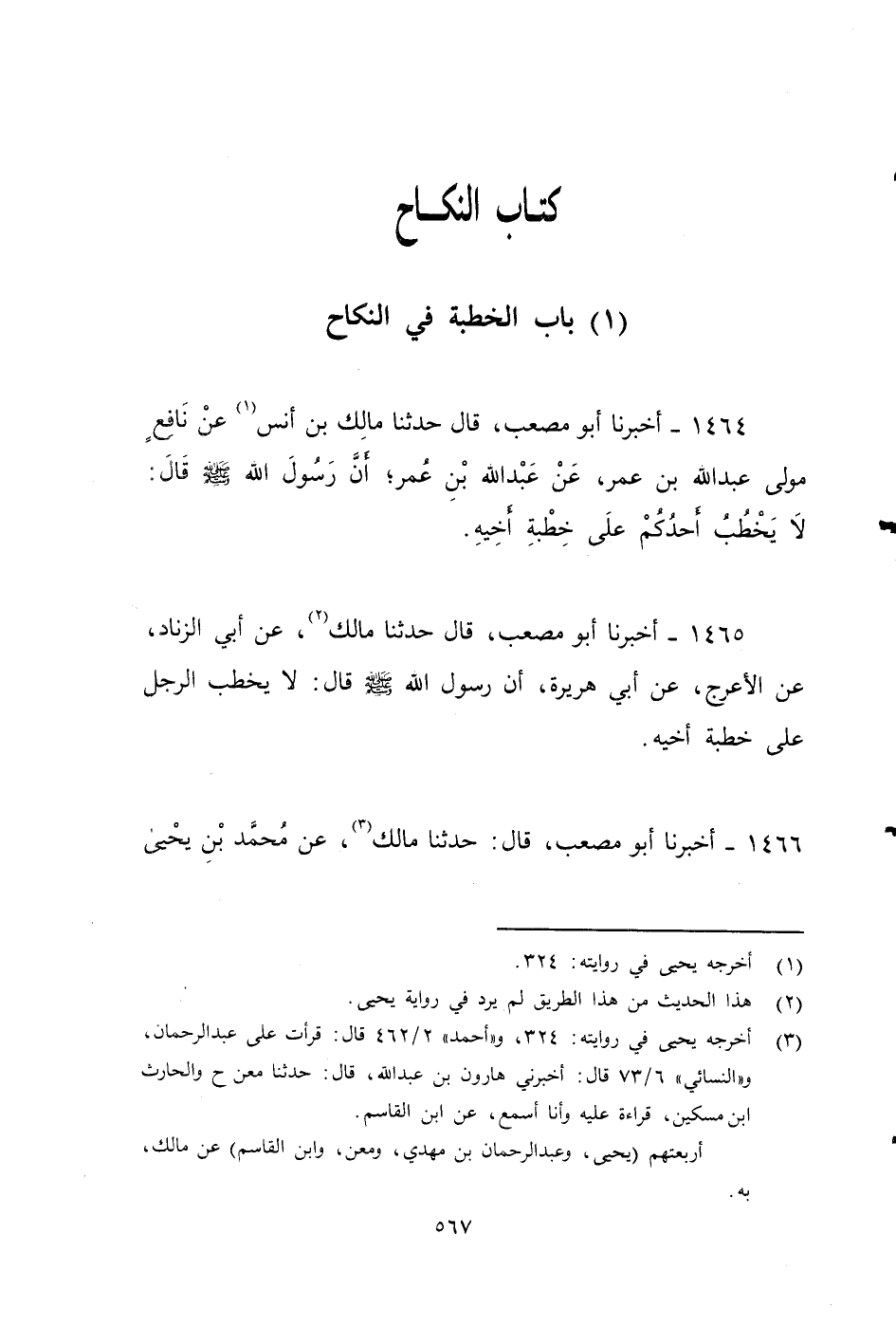 ١٤٦٤ - أخبرنا أَبُو مُصْعَبٍ، قَالَ: حَدَّثَنَا مَالِكٌ بن أنس، عَنْ نَافِعٍ مولى عَبْدِ اللهِ بْنِ عُمَرَ، عَنْ عَبْدِ اللهِ بْنِ عُمَرَ؛ أَنَّ رَسُولَ اللهِ صَلَّى اللَّهُ عَلَيْهِ وَسَلَّمَ قَالَ: لَا يَخْطُبُ أَحَدُكُمْ عَلَى خِطْبَةِ أَخِيهِ.