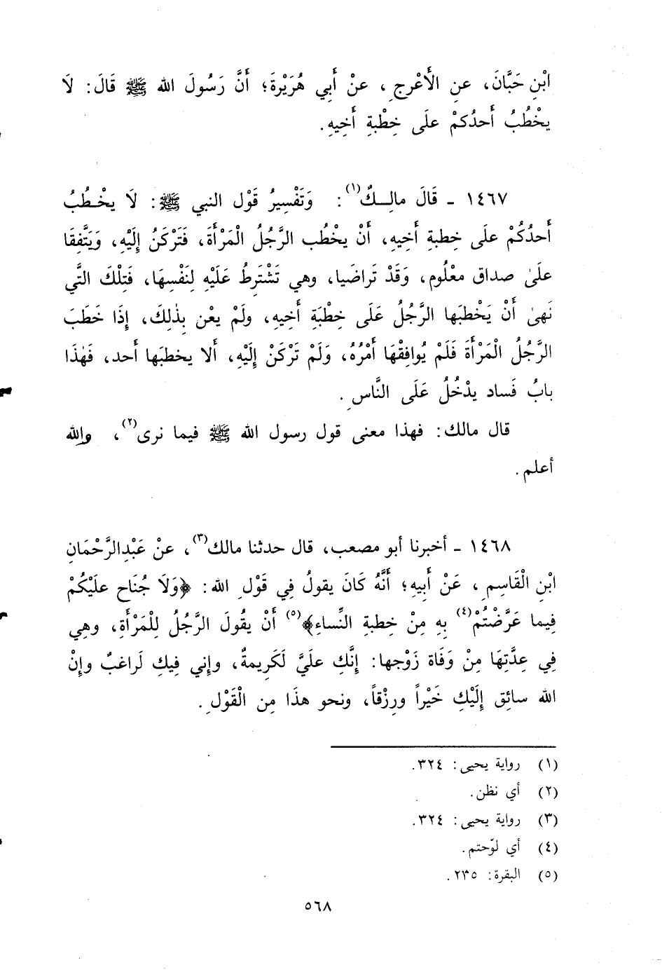 ١٤٦٨ - أخبرنا أَبُو مُصْعَبٍ، قَالَ: حَدَّثَنَا مَالِكٌ، عَنْ عَبْدِ الرَّحْمَنِ بْنِ الْقَاسِمِ، عَنْ أَبِيهِ , أَنَّهُ كَانَ يَقُولُ فِي قَوْلِ اللهِ: {ولَا جُنَاحَ عَلَيْكُمْ فِيمَا عَرَّضْتُمْ بِهِ مِنْ خِطْبَةِ النِّسَاءِ} أَنْ يَقُولَ الرَّجُلُ لِلْمَرْأَةِ، وَهِيَ فِي عِدَّتِهَا مِنْ وَفَاةِ زَوْجِهَا: إِنَّكِ عَلَيَّ لَكَرِيمَةٌ , وَإِنِّي فِيكِ لَرَاغِبٌ، وَإِنَّ اللَّهَ سَائِقٌ إِلَيْكِ خَيْرًا وَرِزْقًا، وَنَحْوَ هَذَا مِنَ الْقَوْلِ.