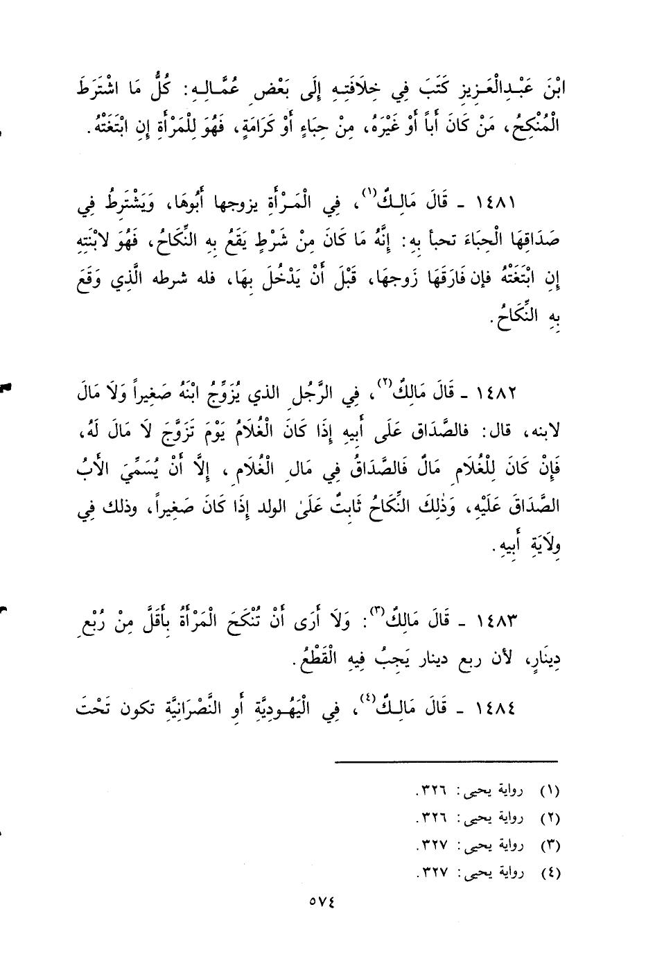 ١٤٨٠ - أَخْبَرَنَا أَبُو مُصْعَبٍ، قَالَ: حَدَّثَنَا مَالِكٌ؛ أَنَّهُ بَلَغَهُ، أَنَّ عُمَرَ بْنَ عَبْدِ الْعَزِيزِ كَتَبَ فِي خِلَافَتِهِ إِلَى بَعْضِ عُمَّالِهِ: كُلَّ مَا اشْتَرَطَ الْمُنْكِحُ , مَنْ كَانَ أَبًا أَوْ غَيْرَهُ مِنْ حِبَاءٍ، أَوْ كَرَامَةٍ , فَهُوَ لِلْمَرْأَةِ إِنِ ابْتَغَتْهُ.
