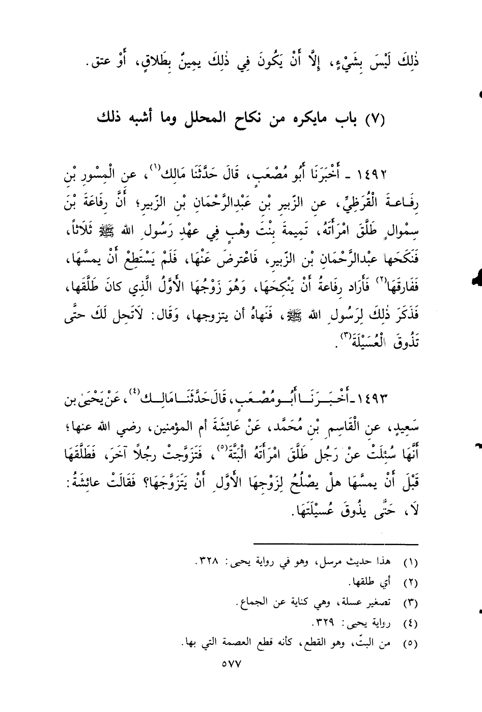 ١٤٩٣ - أَخْبَرَنَا أَبُو مُصْعَبٍ، قَالَ: حَدَّثَنَا مَالِكٌ، عَنْ يَحْيَى بْنِ سَعِيدٍ، عَنِ الْقَاسِمِ بْنِ مُحَمَّدٍ، عَنْ عَائِشَةَ , أم الؤمنين - رضي الله عنها -، أَنَّهَا سُئِلَتْ عَنْ رَجُلٍ طَلَّقَ امْرَأَتَهُ الْبَتَّةَ، فَتَزَوَّجَت رَجُلاً آخَرُ , فَطَلَّقَهَا قَبْلَ أَنْ يَمَسَّهَا، هَلْ يَصْلُحُ لِزَوْجِهَا الأََوَّلِ أَنْ يَتَزَوَّجَهَا؟ فَقَالَتْ عَائِشَةُ: لَا حَتَّى يَذُوقَ عُسَيْلَتَهَا.
