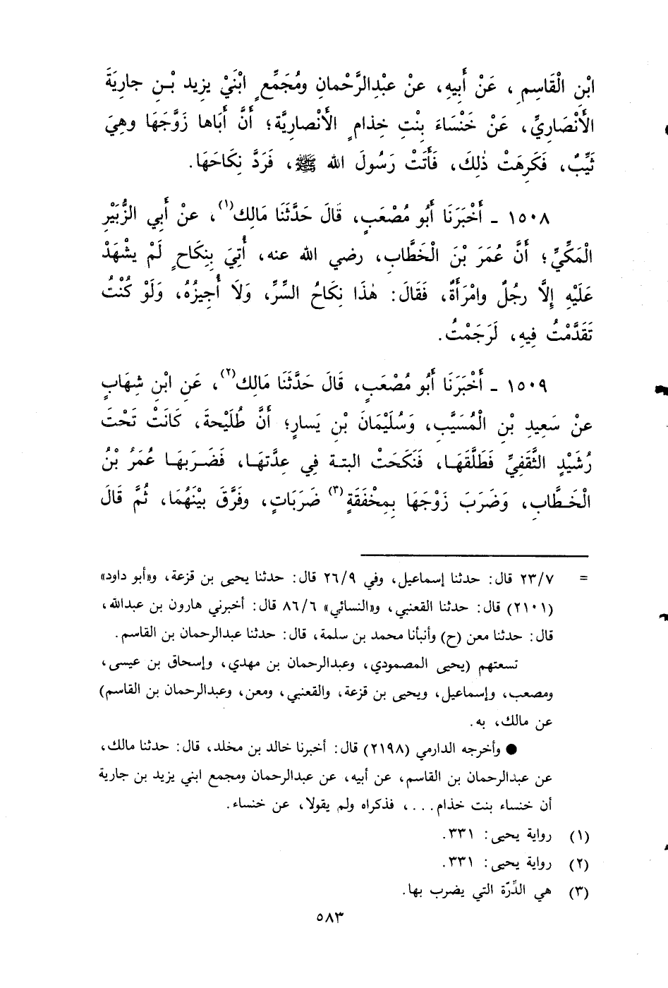 ١٥٠٨ - أَخْبَرَنَا أَبُو مُصْعَبٍ، قَالَ: حَدَّثَنَا مَالِكٌ، عَنْ أَبِي الزُّبَيْرِ الْمَكِّيِّ، أَنَّ عُمَرَ بْنَ الْخَطَّابِ - رضي الله عنه - أُتِيَ بِنِكَاحٍ لَمْ يَشْهَدْ عَلَيْهِ إِلَاّ رَجُلٌ وَامْرَأَةٌ، فَقَالَ: هَذَا نِكَاحُ السِّرِّ , وَلَا أُجِيزُهُ , وَلَوْ كُنْتُ تَقَدَّمْتُ فِيهِ لَرَجَمْتُ.