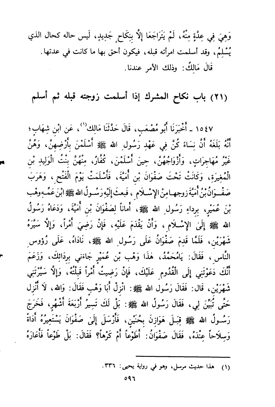 ١٥٤٧ - أَخْبَرَنَا أَبُو مُصْعَبٍ، قَالَ: حَدَّثَنَا مَالِكٌ، عَنِ ابْنِ شِهَابٍ، أَنَّهُ بلغه: أَنَّ نِسَاءً كُنَّ فِي عَهْدِ رَسُولِ اللَّهِ صَلَّى اللَّهُ عَلَيْهِ وَسَلَمَ، أسْلِمْنَ بِأَرْضِهِنَّ، وَهُنَّ غَيْرُ مُهَاجِرَاتٍ، وَأَزْوَاجُهُنَّ حِينَ أَسْلَمْنَ كُفَّارٌ، مِنْهُنَّ بِنْتُ الْوَلِيدِ بْنِ الْمُغِيرَةِ، وَكَانَتْ تَحْتَ صَفْوَانَ بْنِ أُمَيَّةَ، فَأَسْلَمَتْ يَوْمَ الْفَتْحِ، وَهَرَبَ صَفْوَانُ بْنُ أُمَيَّةَ زَوْجُهَا مِنَ الْإِسْلَامِ، فَبَعَثَ إِلَيْهِ رَسُولُ اللَّهِ صَلَّى اللَّهُ عَلَيْهِ وَسَلَمَ ابْنَ عَمِّهِ وَهْبَ بْنَ عُمَيْرٍ، بِرِدَاءِ رَسُولِ اللَّهِ صَلَّى اللَّهُ عَلَيْهِ وَسَلَمَ أَمَانًا لِصَفْوَانَ بْنِ أُمَيَّةَ، وَدَعَاهُ رَسُولُ اللَّهِ صَلَّى اللَّهُ عَلَيْهِ وَسَلَمَ إِلَى الْإِسْلَامِ، وَأَنْ يَقْدَمَ عَلَيْهِ، فَإِنْ رَضِيَ أَمْرًا، وَإِلَّا سَيَّرَهُ شَهْرَيْنِ، فَلَمَّا قَدِمَ صَفْوَانُ عَلَى رَسُولِ اللَّهِ صَلَّى اللَّهُ عَلَيْهِ وَسَلَمَ، نَادَاهُ عَلَى رُءُوسِ النَّاسِ، فَقَالَ: يَا مُحَمَّدُ، هَذَا وَهْبَ بْنَ عُمَيْرٍ جَاءَنِي بِرِدَائِكَ، وَزَعَمَ أَنَّكَ دَعَوْتَنِي إِلَى الْقُدُومِ عَلَيْكَ، فَإِنْ رَضِيتُ أَمْرًا قَبِلْتُهُ، وَإِلَّا سَيَّرْتَنِي شَهْرَيْنِ، قال: فَقَالَ رَسُولُ اللَّهِ صَلَّى اللَّهُ عَلَيْهِ وَسَلَمَ: انْزِلْ أَبَا وَهْبٍ، فَقَالَ: وَاللَّهِ لا أَنْزِلُ حَتَّى تُبَيِّنَ لِي، فَقَالَ رَسُولُ اللَّهِ صَلَّى اللَّهُ عَلَيْهِ وَسَلَمَ: بَلْ لَكَ تَسِيرُ أَرْبَعَةَ أَشْهُرٍ، فَخَرَجَ رَسُولُ اللَّهِ صَلَّى اللَّهُ عَلَيْهِ وَسَلَمَ قِبَلَ هَوَازِنَ بِحُنَيْنٍ، فَأَرْسَلَ إِلَى صَفْوَانَ يَسْتَعِيرُهُ أَدَاةً، وَسِلَاحًا عِنْدَهُ، فَقَالَ صَفْوَانُ: أَطَوْعًا أَمْ كَرْهًا؟ فَقَالَ: بَلْ طَوْعًا، فَأَعَارَهُ الأَدَاةَ، وَالسِّلَاحَ التي عِنْدَهُ، ثُمَّ خَرَجَ صَفْوَانُ مَعَ رَسُولِ اللَّهِ صَلَّى اللَّهُ عَلَيْهِ وَسَلَمَ وَهُوَ كَافِرٌ، فَشَهِدَ حُنَيْنًا وَالطَّائِفَ، وَهُوَ كَافِرٌ، وَامْرَأَتُهُ مُسْلِمَةٌ، وَلَمْ يُفَرِّقْ رَسُولُ اللَّهِ صَلَّى اللَّهُ عَلَيْهِ وَسَلَمَ بَيْنَهُ وَبَيْنَ أهلهِ، حَتَّى أَسْلَمَ صَفْوَانُ، وَاسْتَقَرَّتِ امْرَأَتُهُ عِنْدَهُ بِذَلِكَ النِّكَاحِ.