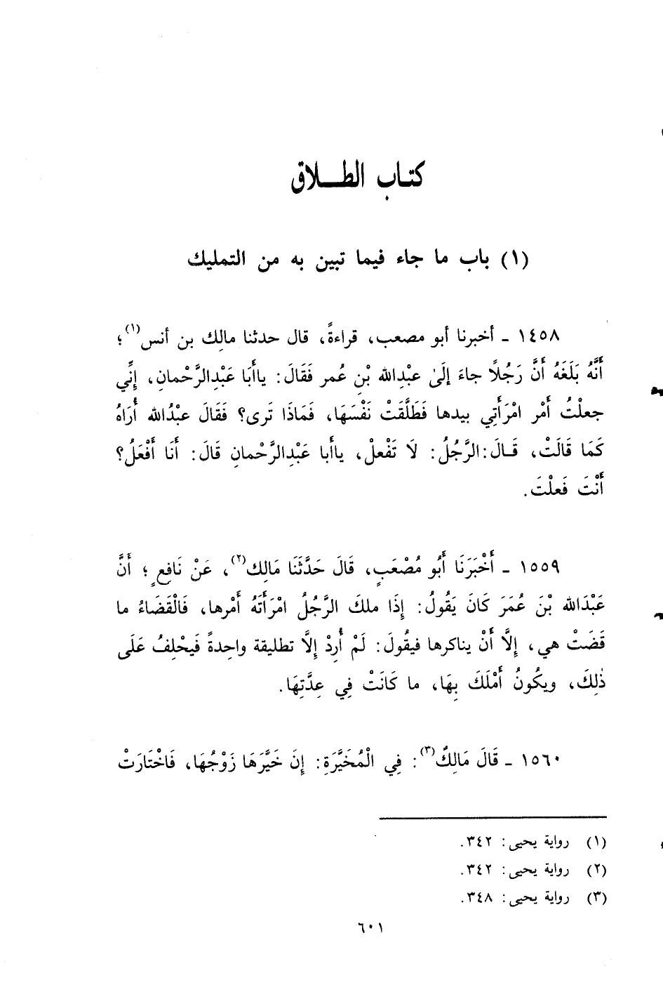 ١٥٥٨ - أَخْبَرَنَا أَبُو مُصْعَبٍ قراءة، قَالَ: حَدَّثَنَا مَالِكٌ بن أنس؛ أَنَّهُ بَلَغَهُ، أَنَّ رَجُلاً جَاءَ إِلَى عَبْدِ اللهِ بْنِ عُمَرَ، فَقَالَ: يَا أَبَا عَبْدِ الرَّحْمَنِ , إِنِّي جَعَلْتُ أَمْرَ امْرَأَتِي بيَدِهَا، فَطَلَّقَتْ نَفْسَهَا، فَمَاذَا تَرَى؟ فَقَالَ عَبْدُ اللهِ: أُرَاهُ كَمَا قَالَتْ، فَقَالَ الرَّجُلُ: لَا تَفْعَلْ يَا أَبَا عَبْدِ الرَّحْمَنِ، قَالَ: أَنَا أَفْعَلُ؟ أَنْتَ فَعَلْتَ.